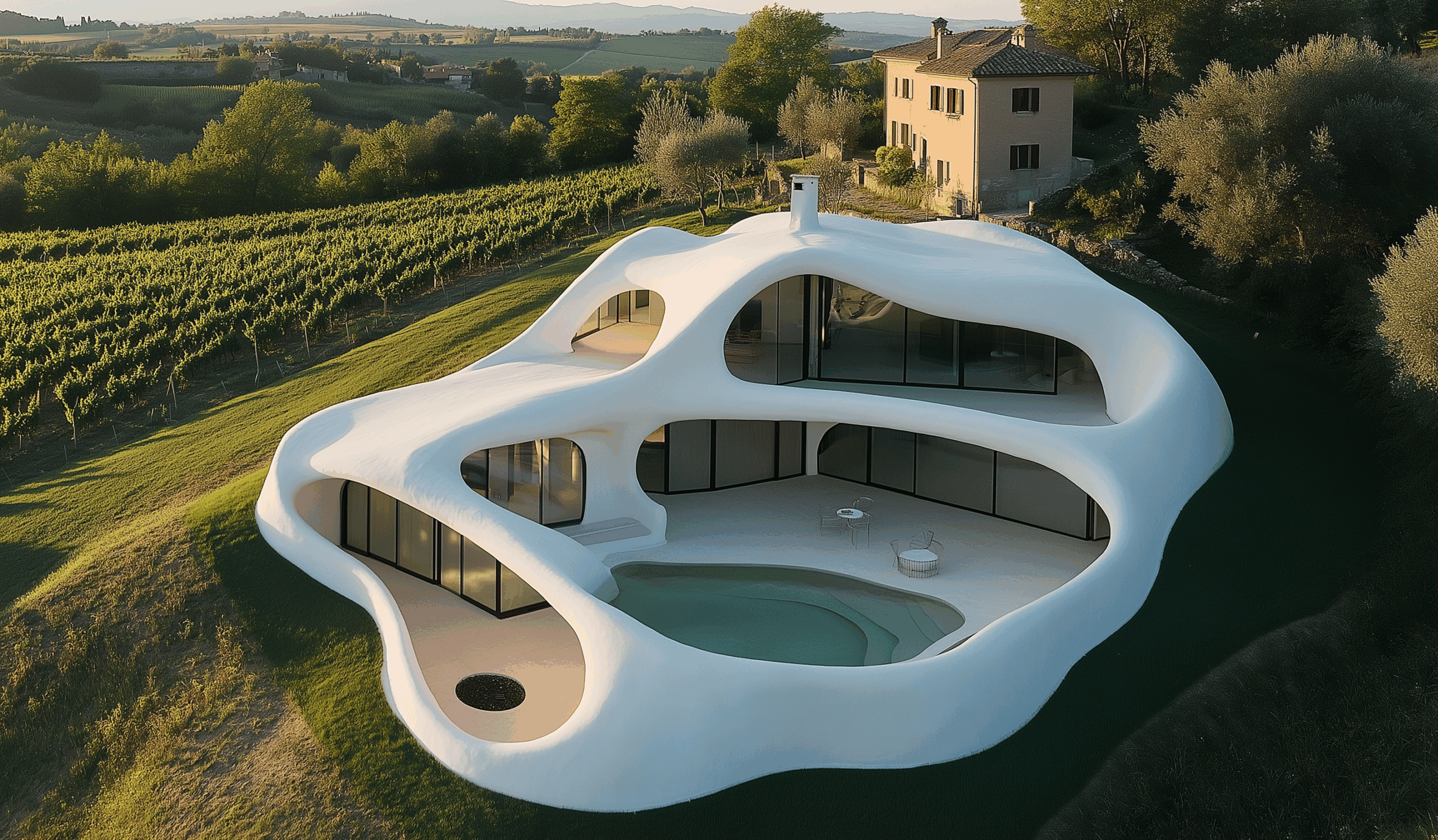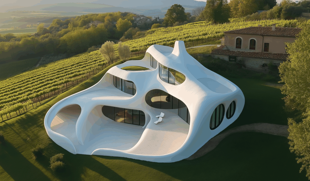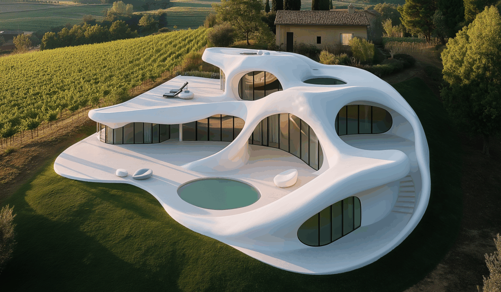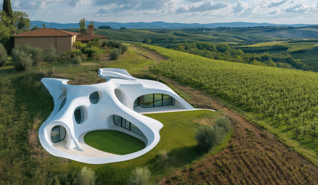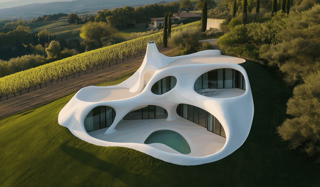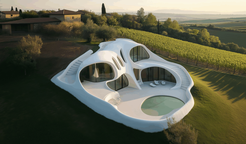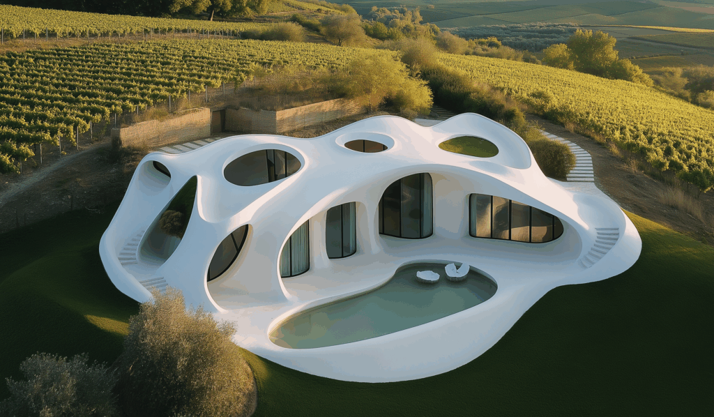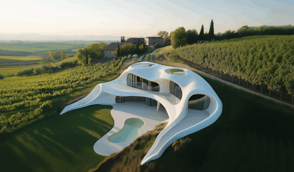 - Doğayla Akış: Form, arazinin kıvrımlarına uyum sağlar, yer çekimiyle değil, organik bir dengeyle durur.