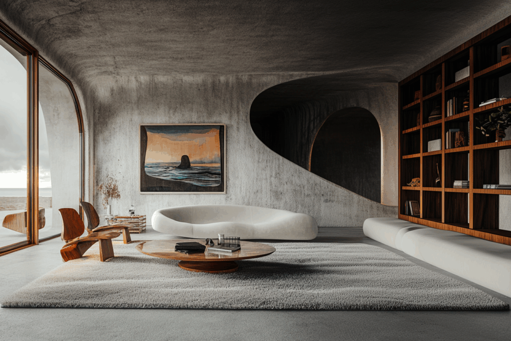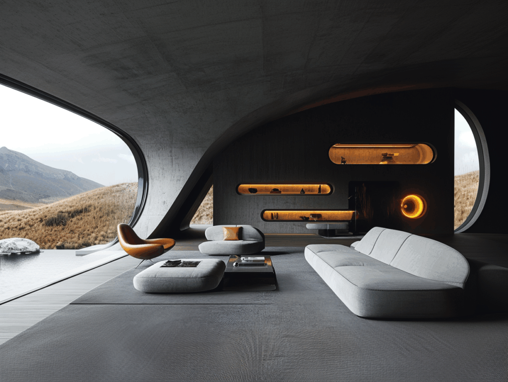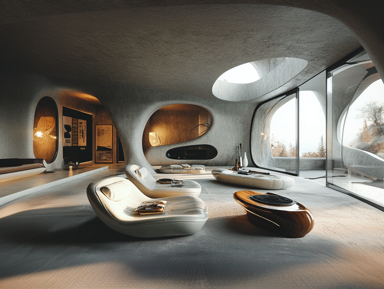 - İç Mekân: Organik formlu duvarlar + mikro çimento yüzeyler