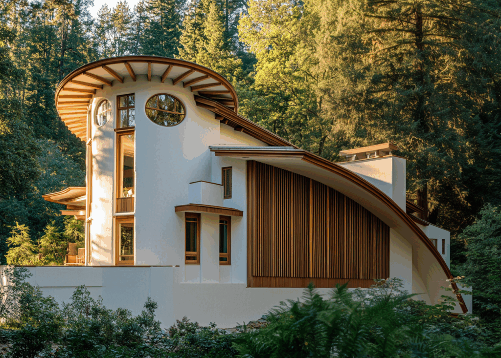 Kavisli çatı formları, ağaç gövdelerinin doğal eğrilerini çağrıştırıyor ve yapının ormanla uyumlu bir siluet kazanmasını sağlıyor. Çatının altında kullanılan ahşap dikey paneller, hem cepheyi ritmik bir şekilde bölerken hem de gölge oyunları yaratarak gün boyunca değişken bir ışık atmosferi oluşturuyor.
