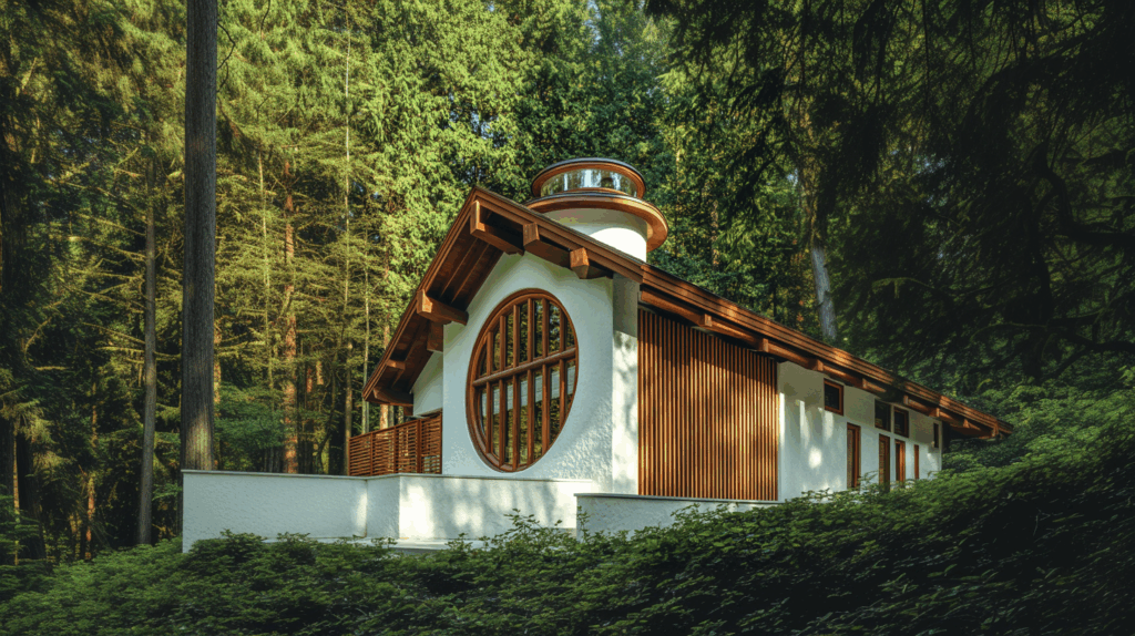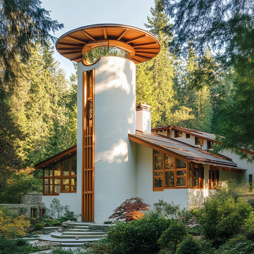 Bu orman evi, doğa ile bütünleşen organik modernizmin karakteristik öğelerini taşıyor. Yapının formu, çevresindeki ağaçların göğe yükselen dikeyliğini referans alarak şekillendi. Özellikle yuvarlak kule, hem bir ışık bacası hem de dikey bir vurgu elemanı olarak tasarlandı. Bu kule, gün ışığını üst katlardan süzüp iç mekâna aktarıyor; gece ise içeriden dışarıya yayılan ışık, orman dokusunda bir fener etkisi yaratıyor.