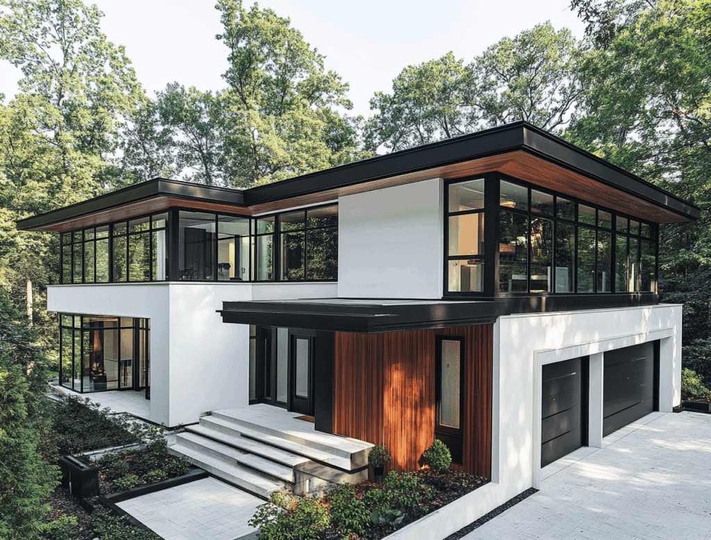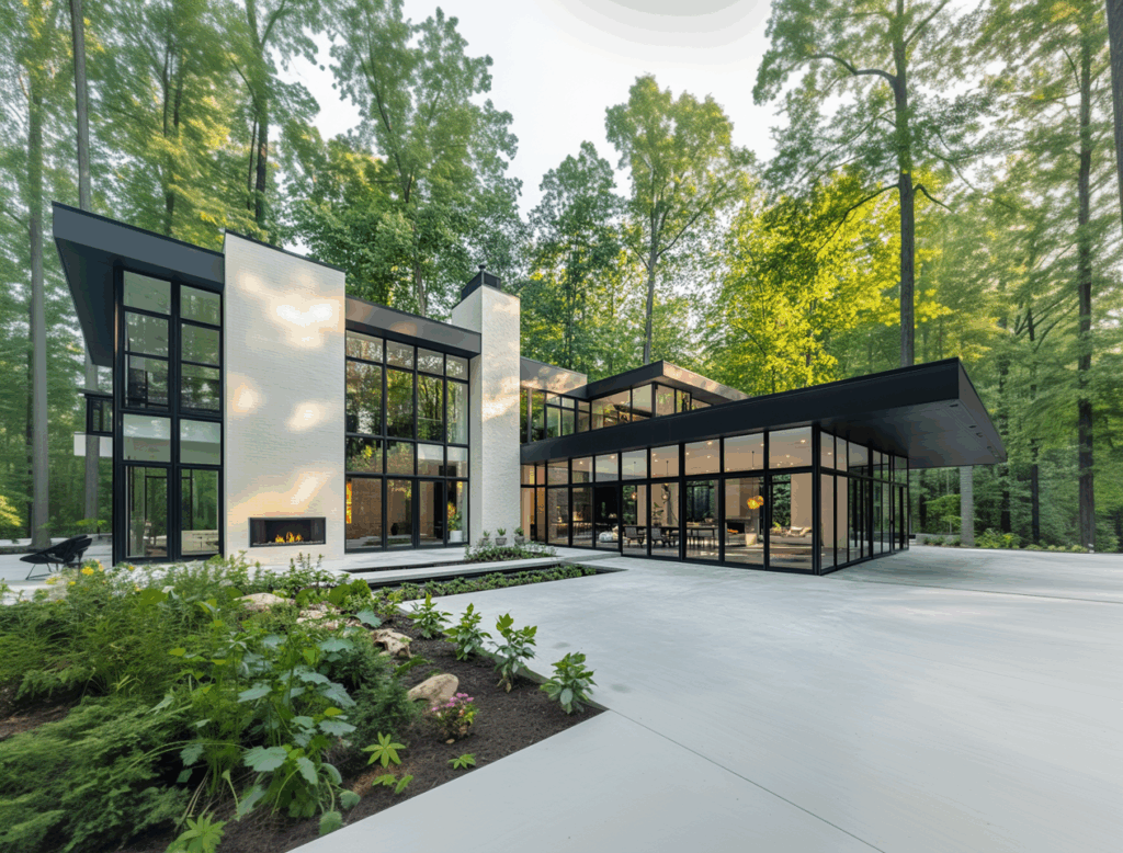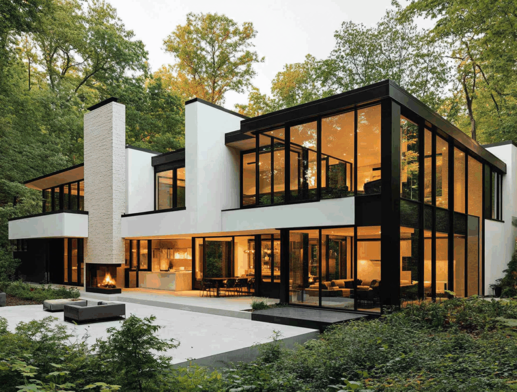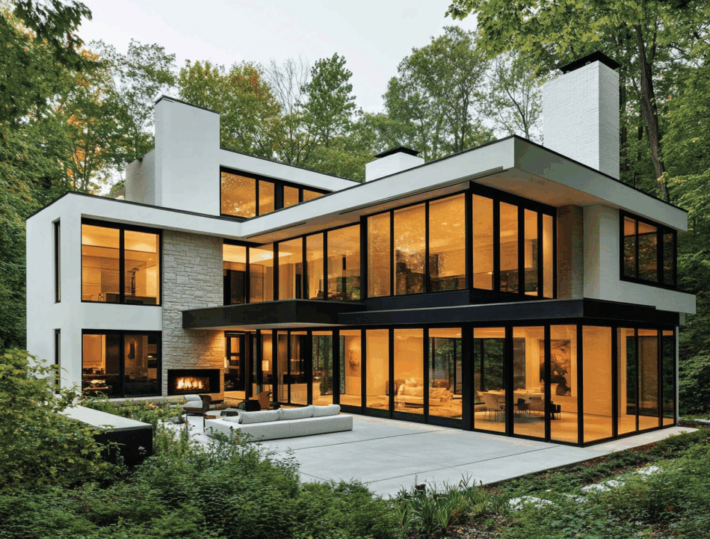 Yapı Malzemeleri: Beyaz beton, siyah metal çerçeveler, cam paneller, doğal ahşap.