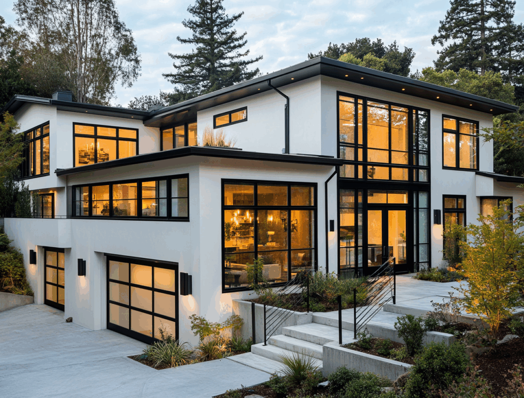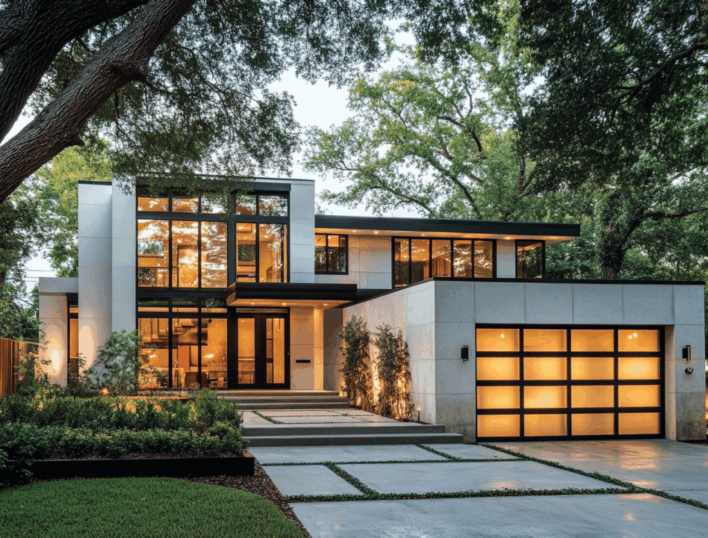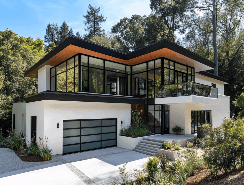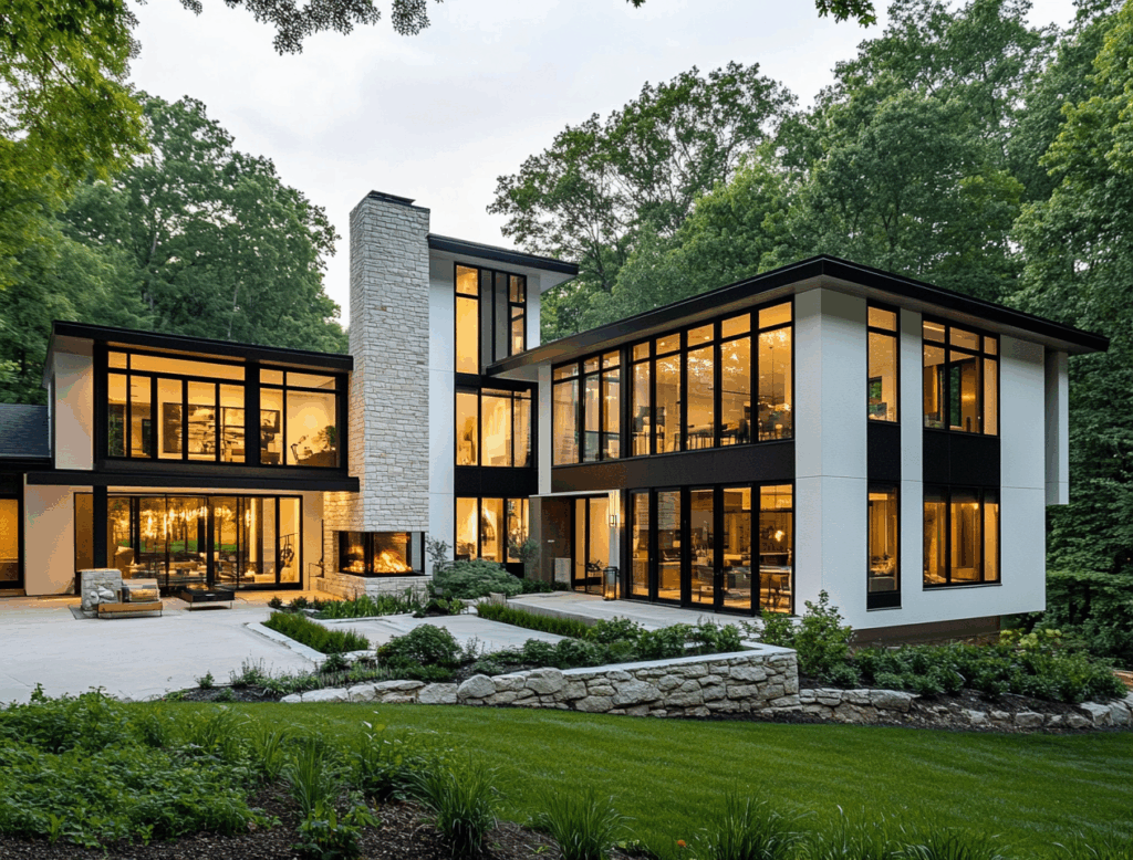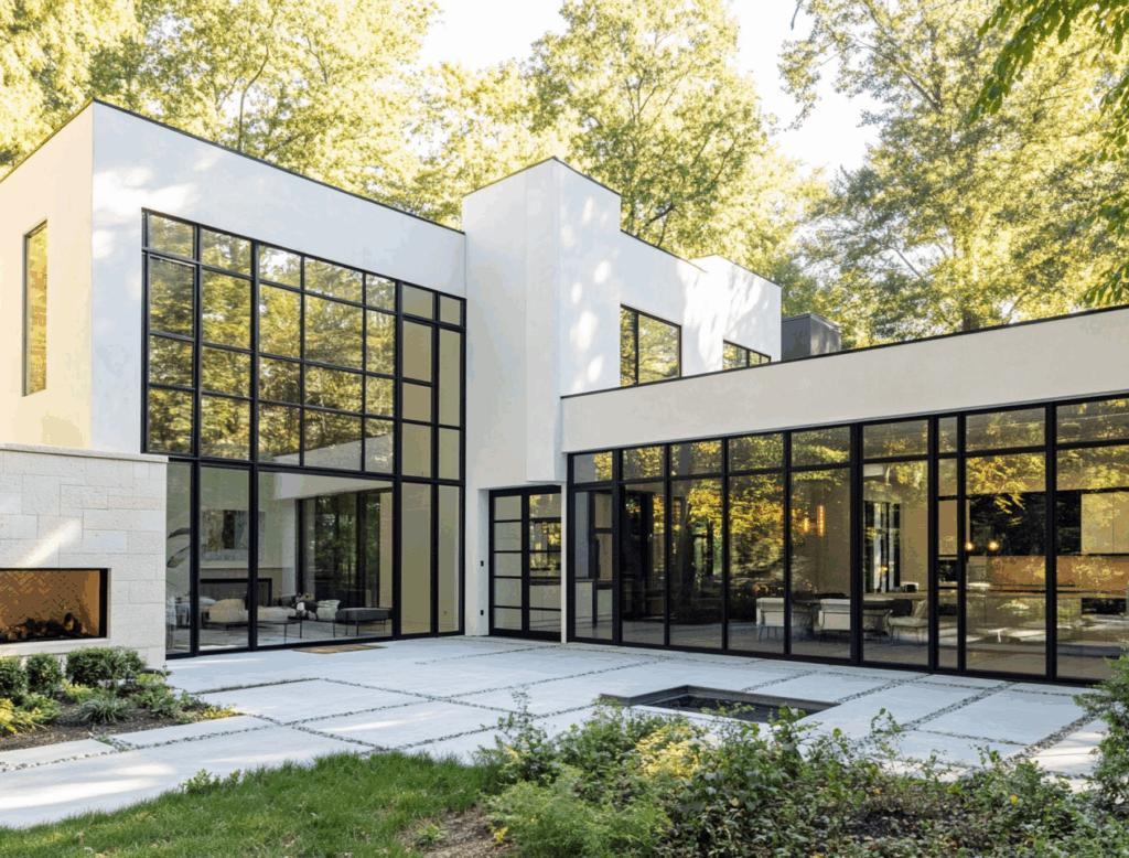 Yapı Malzemeleri: Beyaz beton, siyah metal çerçeveler, cam paneller, doğal ahşap.