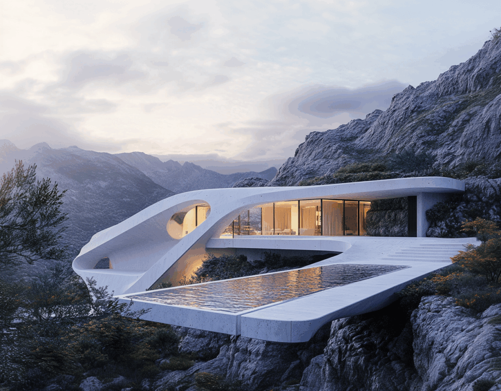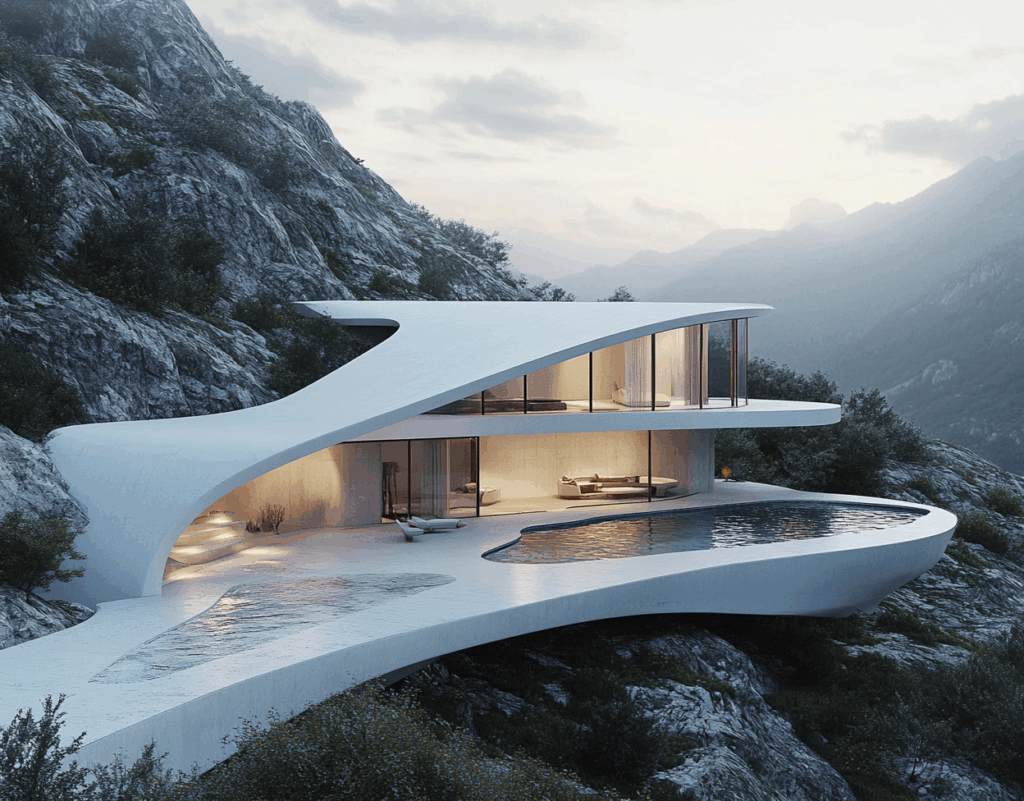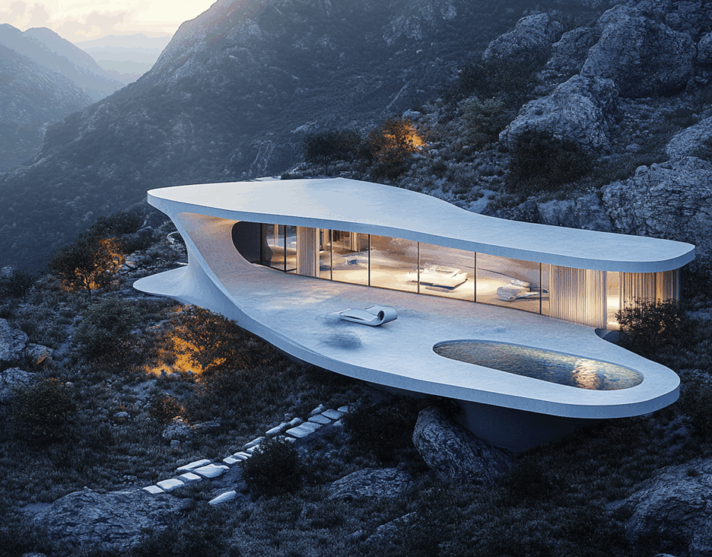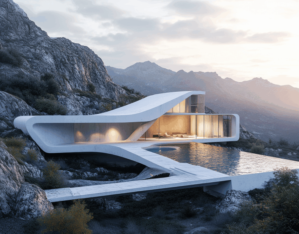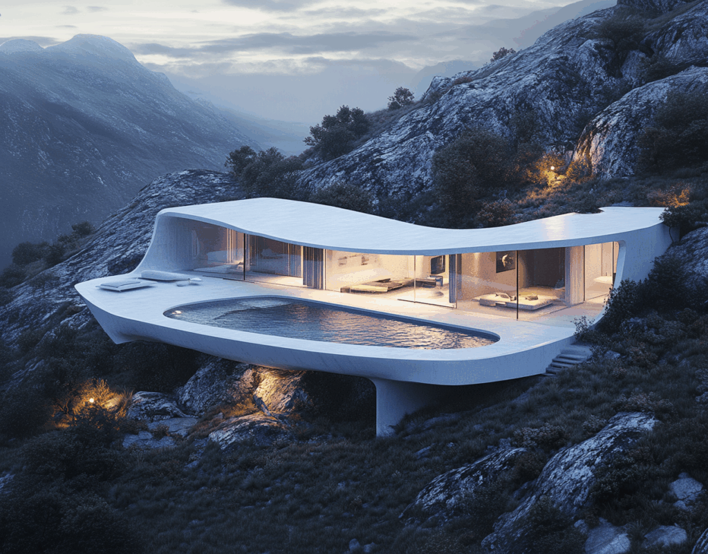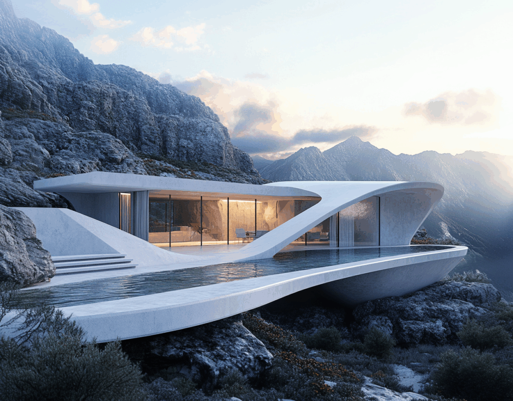 Dağın sert jeolojik formunu takip eden kıvrımlı ve akışkan beton yüzeylerle tasarlanmış. Alt kısımdaki geniş teras, havuz ve yaşam alanlarını doğal peyzajla buluşturuyor. Cam yüzeyler, hem manzaranın iç mekânlara akmasını sağlıyor hem de yapıyı gün boyunca ışığın farklı tonlarıyla dönüştürüyor.