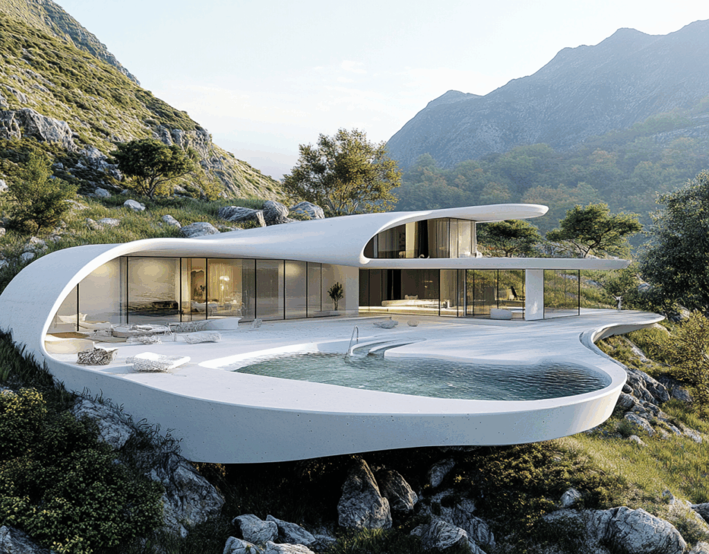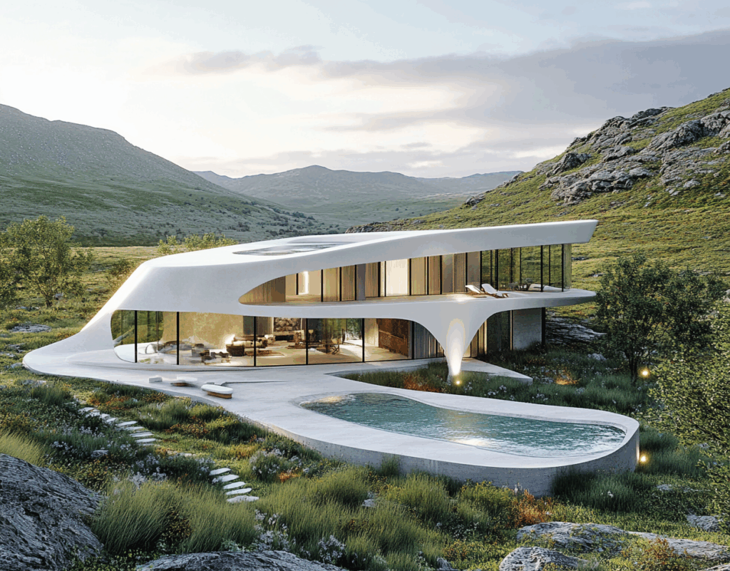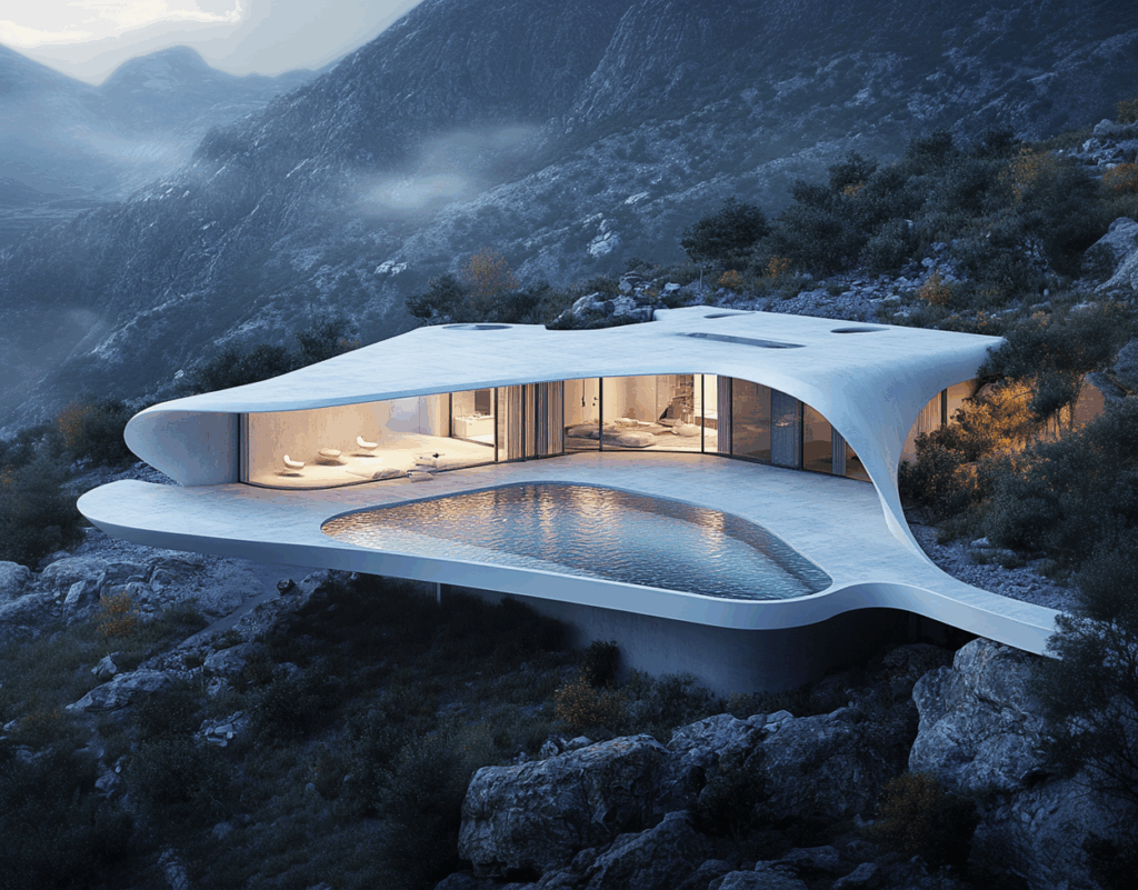 Yapının dış kabuğu, organik bir zar gibi kıvrılarak iç mekânları sarar; aynı yüzeyler teraslara, havuz platformlarına dönüşür.