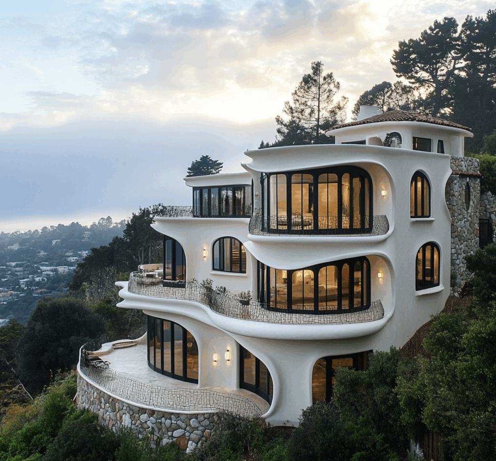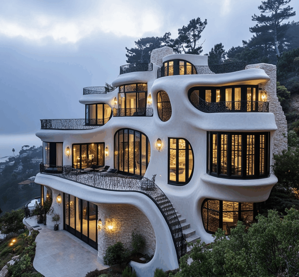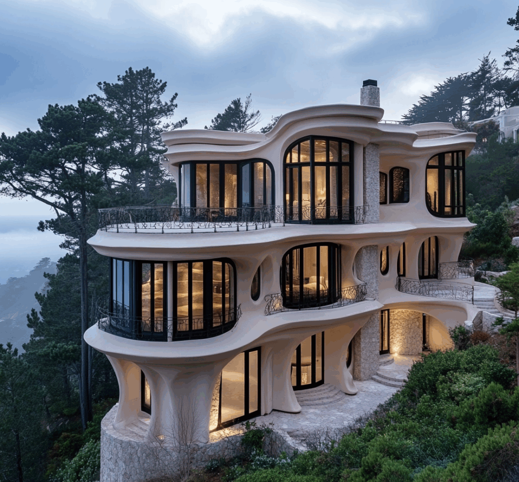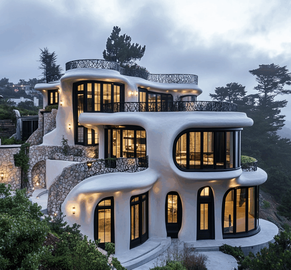 - Bağlam: Doğa, taş ve betonun tek bir akışta birleştiği biyomorfik konut