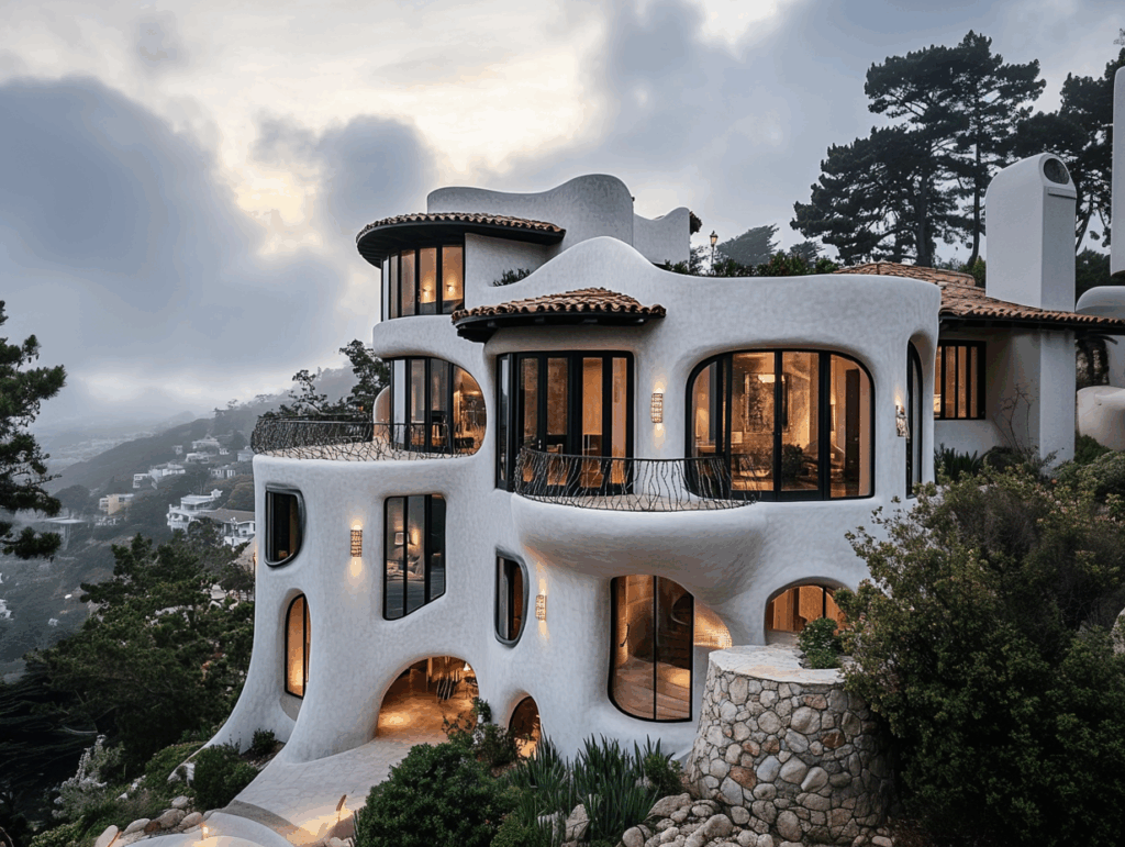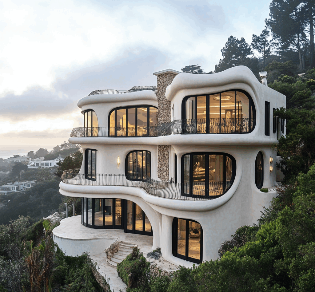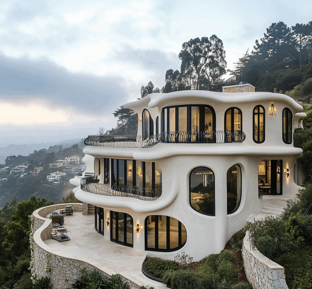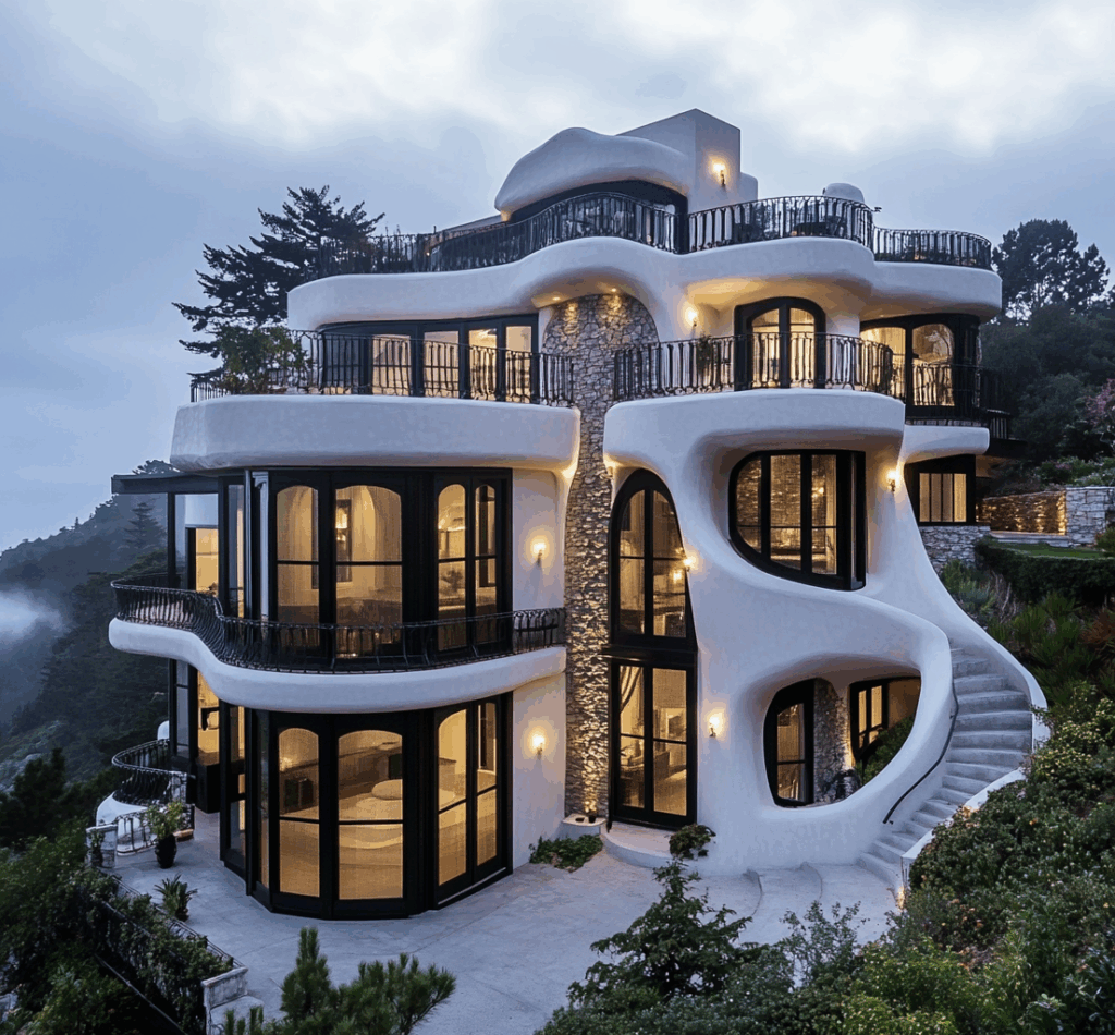 - Bağlam: Doğa, taş ve betonun tek bir akışta birleştiği biyomorfik konut