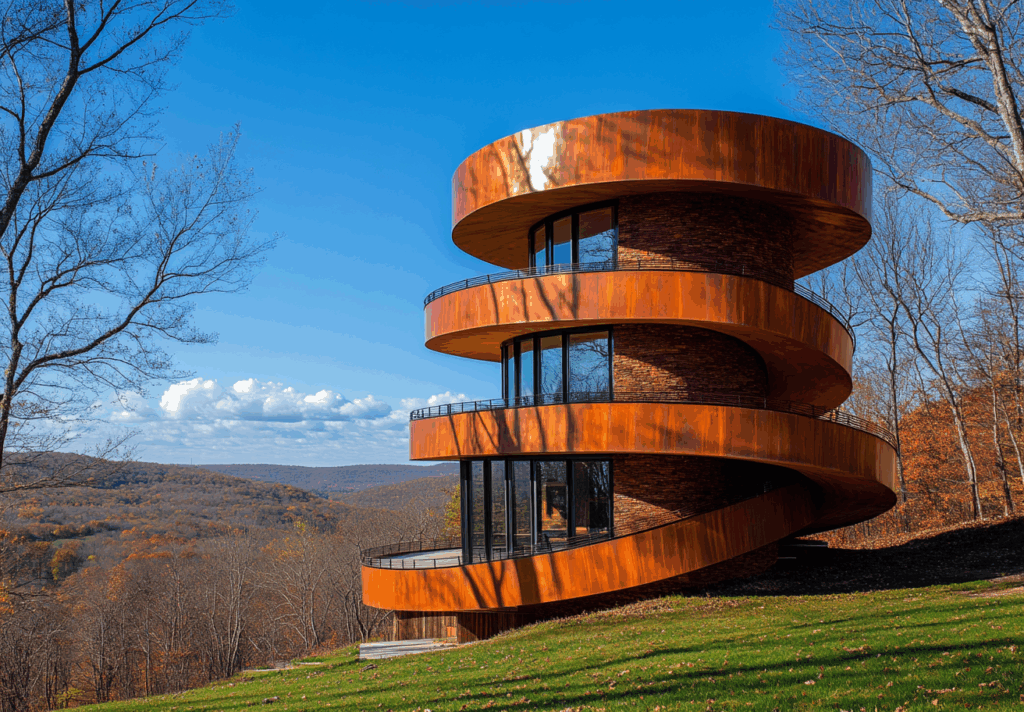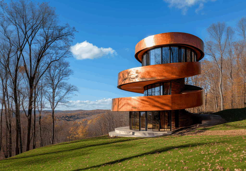 - Işık Kullanımı: Panoramik camlar gün ışığını iç mekâna taşırken, bakır kabuk gölge ve yansıma oyunları yaratır