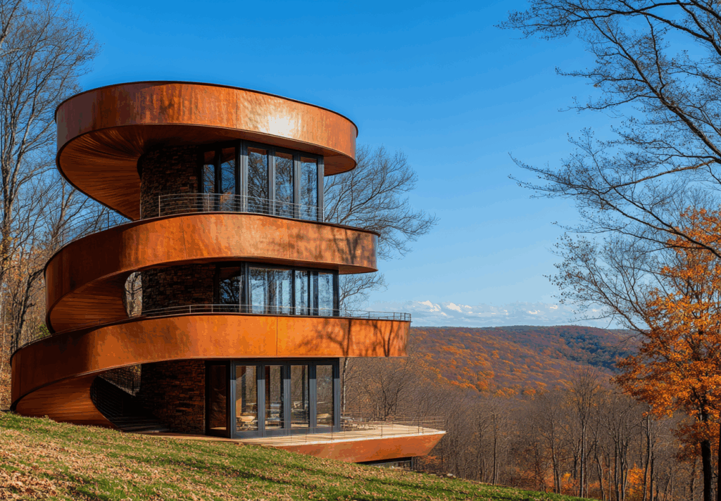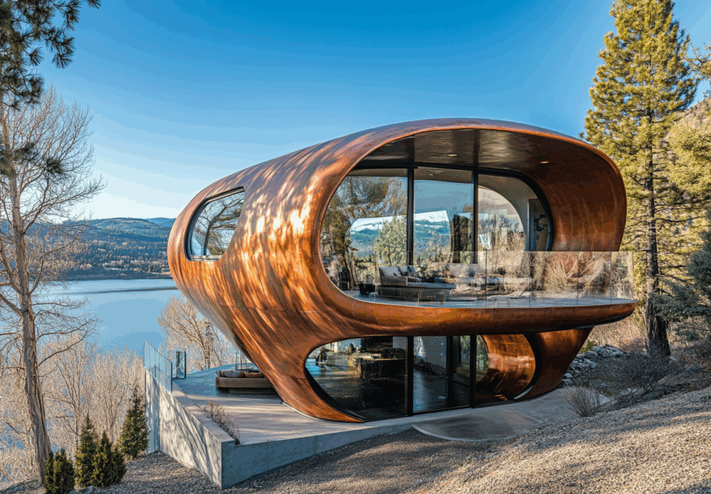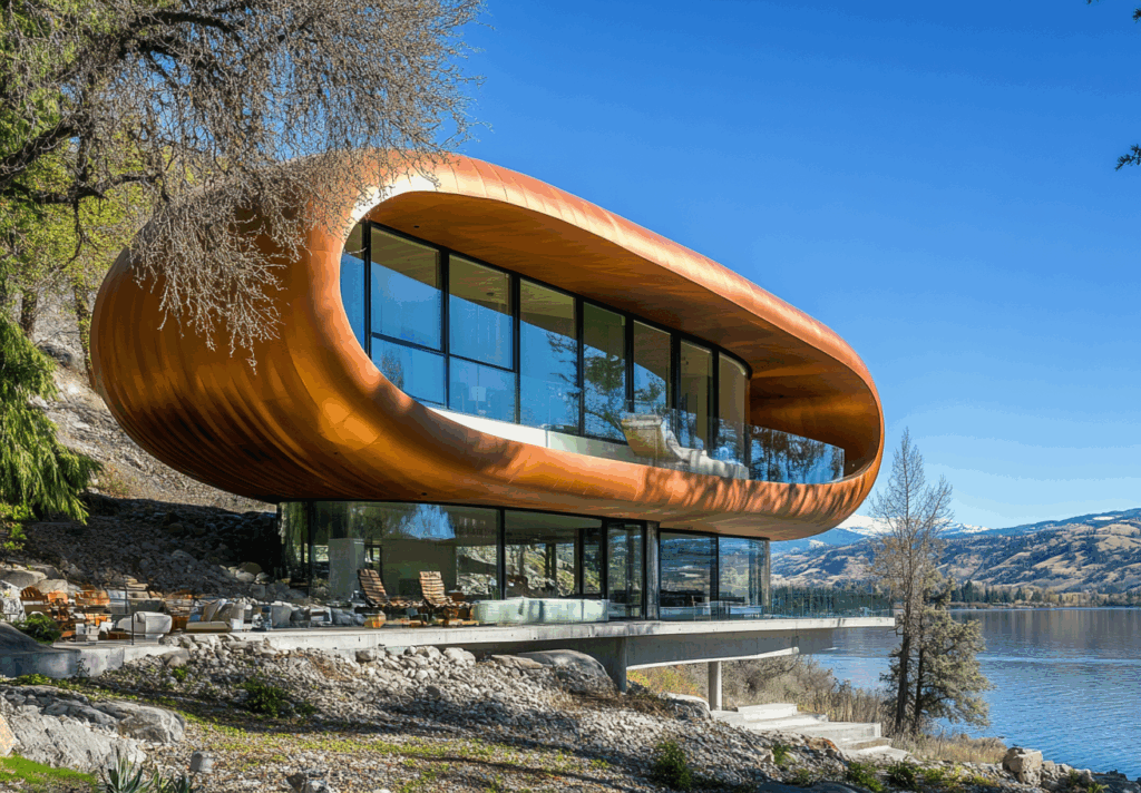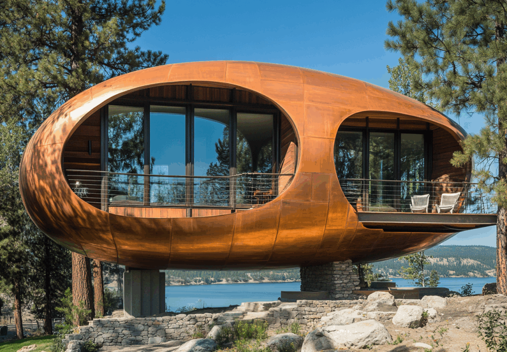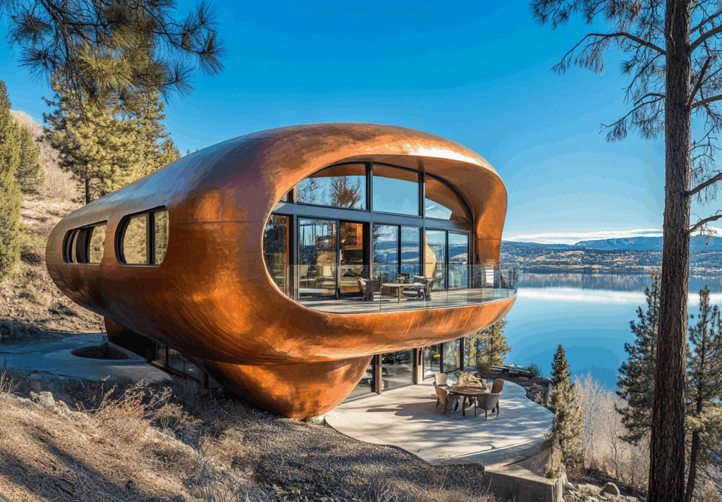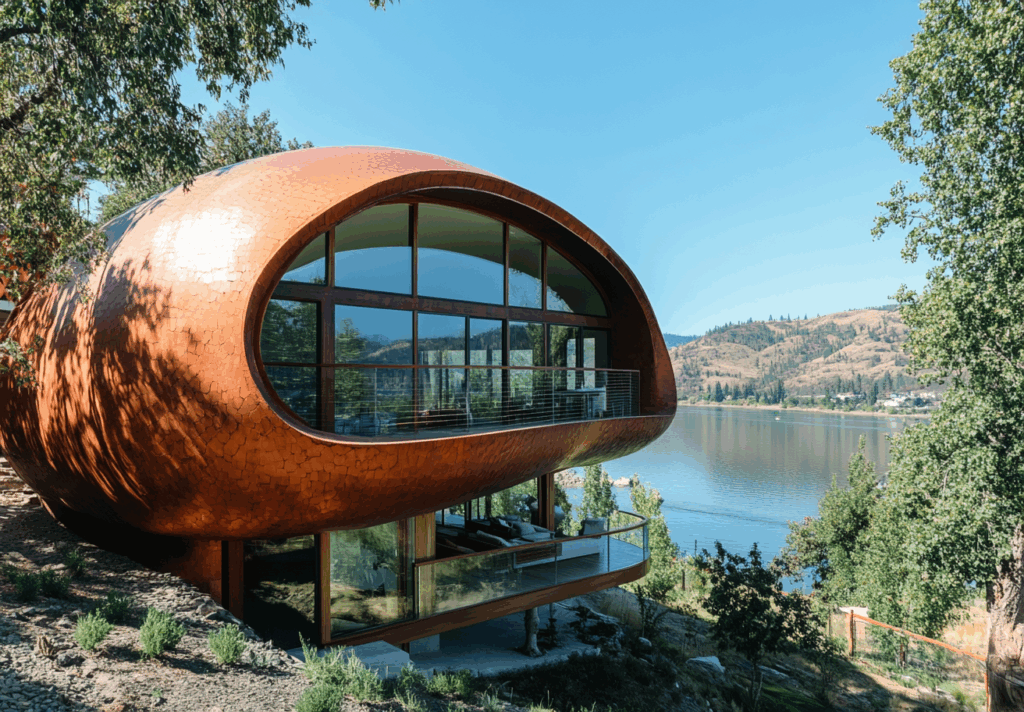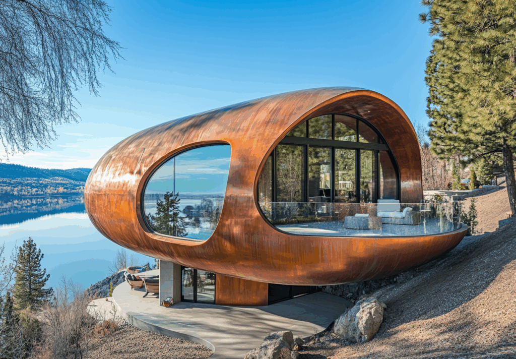 - Bağlam: Göl manzaralı eğimli arazide, doğanın akışına entegre metalik-organik yapı