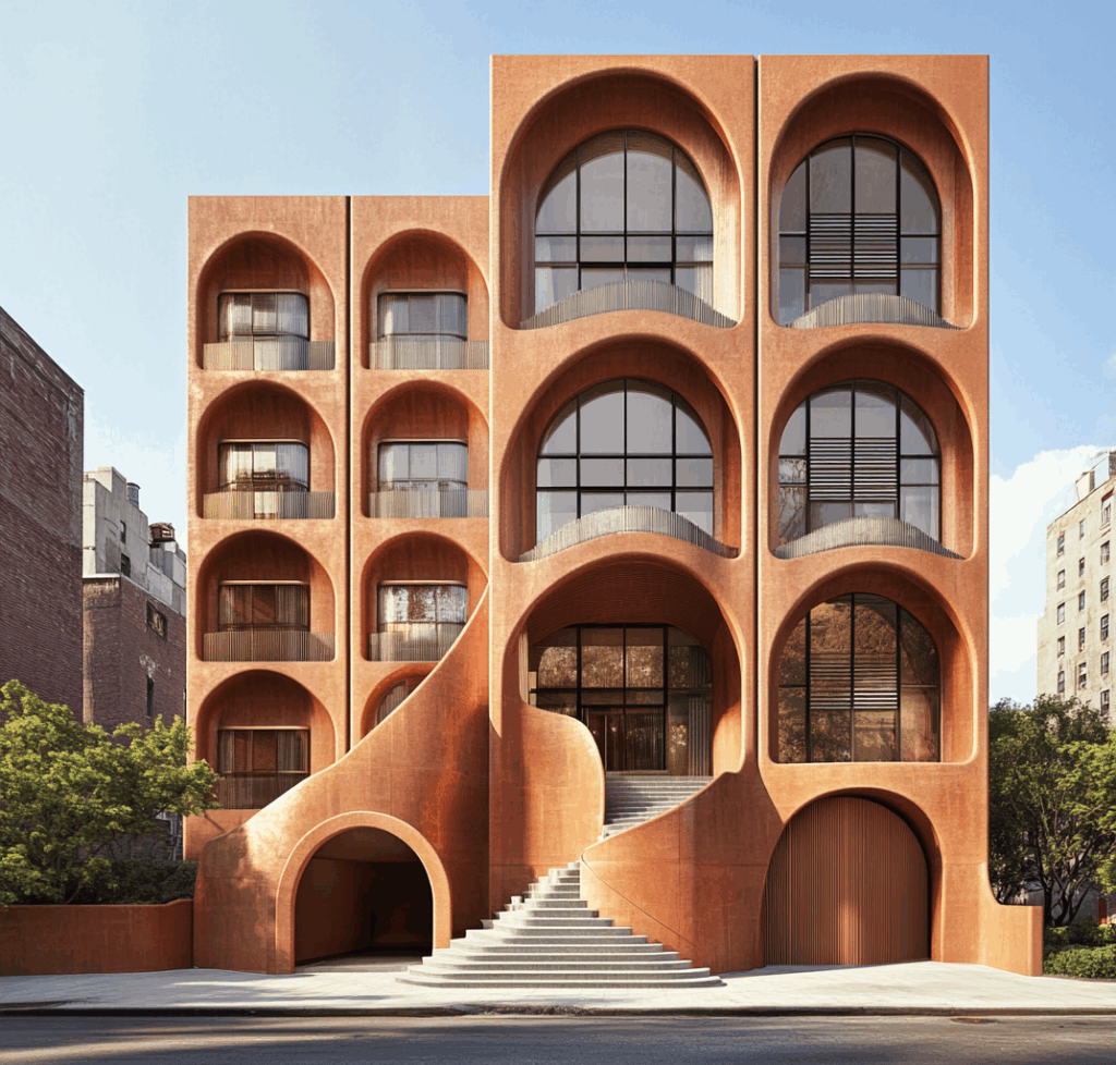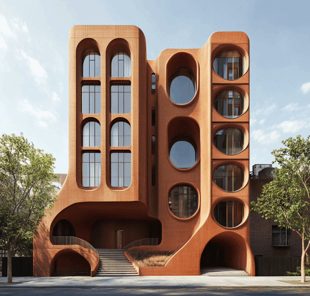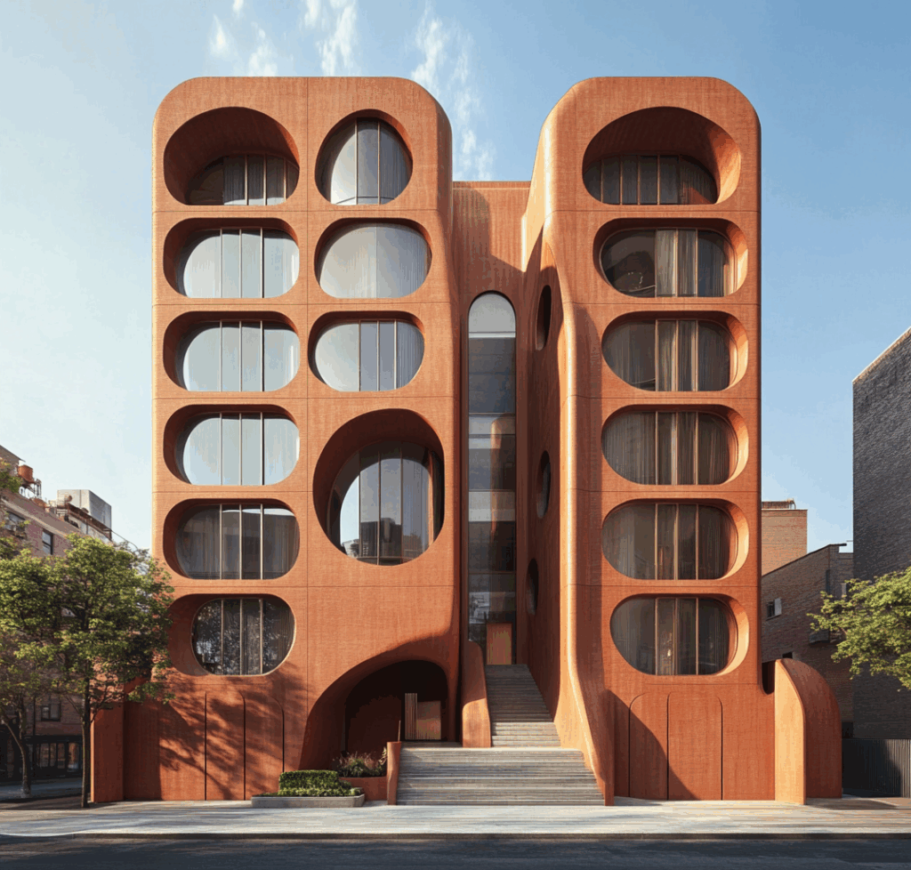Parametric Terracotta Housing, klasik kentsel blok tipolojisini akışkan formlu cephe geometrisiyle yeniden yorumlar.