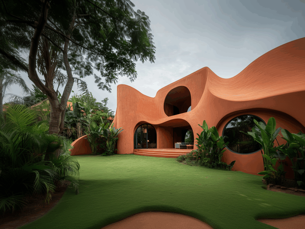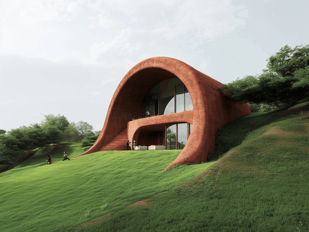 Zeminle birleşen kavisli duvarlar, doğal drenaj ve ısı dengesini sağlar; yapının formu hem estetik hem ekolojik bir denge aracıdır.