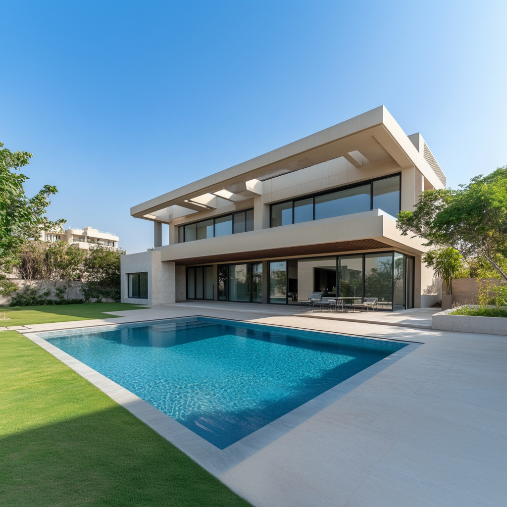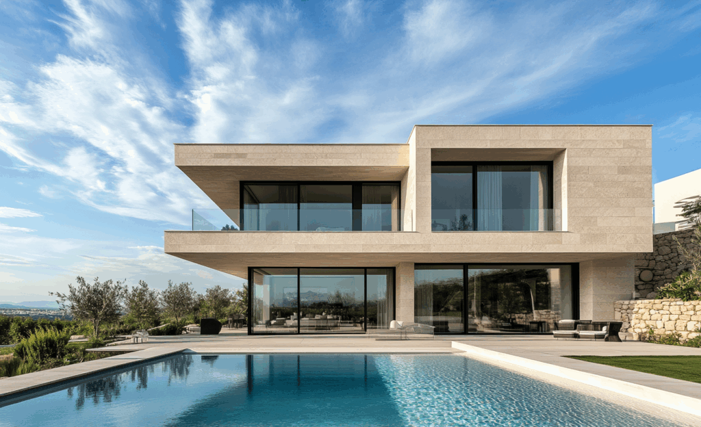 Beyaz beton kütleler, beji taş kaplamalarla birleşerek yalın ama güçlü bir kontrast yaratır.