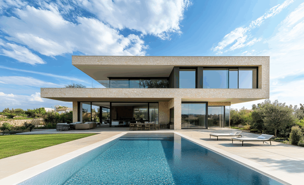 Taş kaplamanın doğal sıcaklığı, camın şeffaflığı ve betonun sağlamlığı bir araya gelerek, villayı hem zamansız hem de çağdaş bir karaktere taşıyor. Bu yapı, modern yaşamın konforunu doğayla uyum içinde yeniden tanımlıyor.
