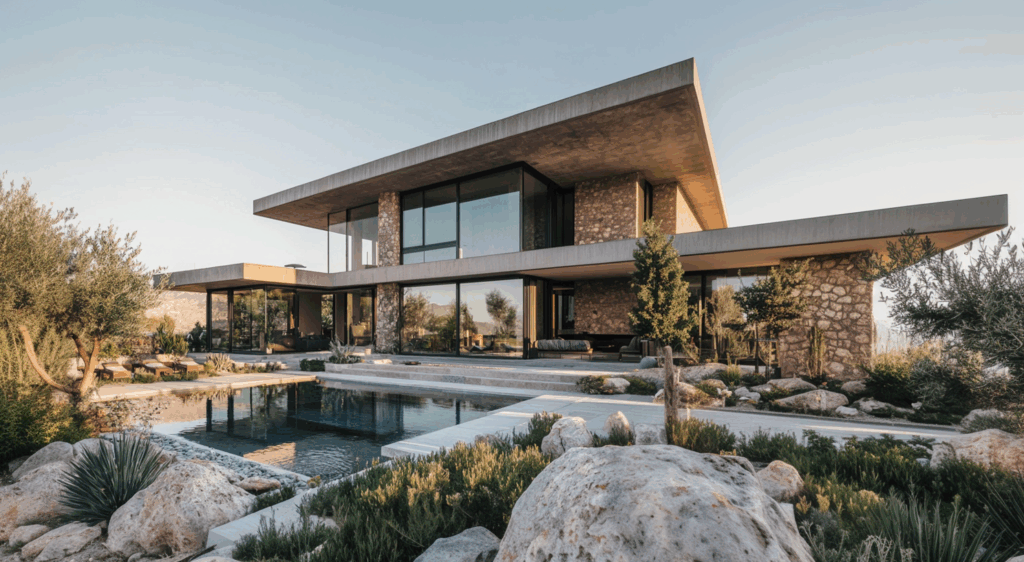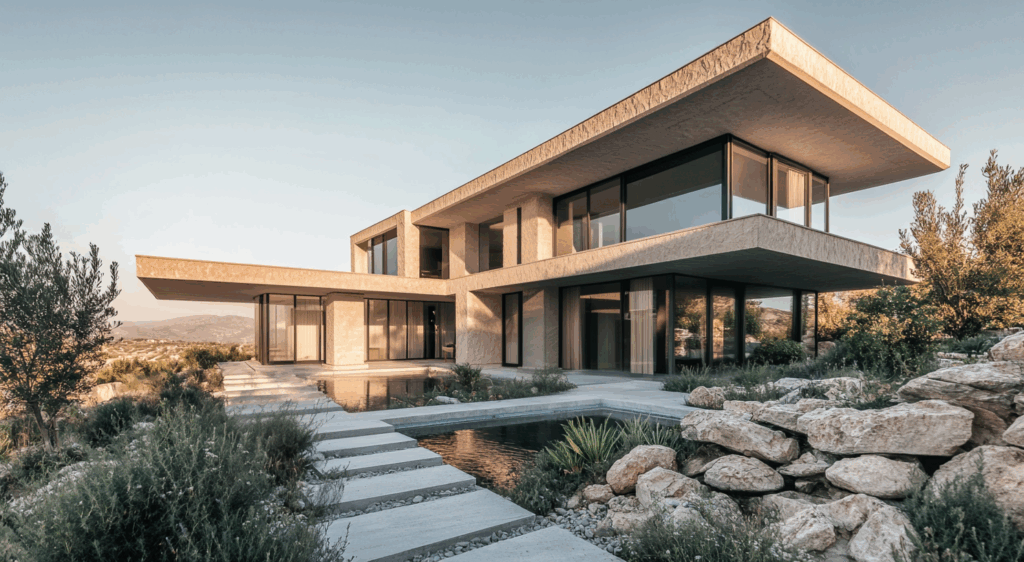 - Cephe Karakteri: Masif beton plakalar + doğal taş yüzeyler + panoramik camlar