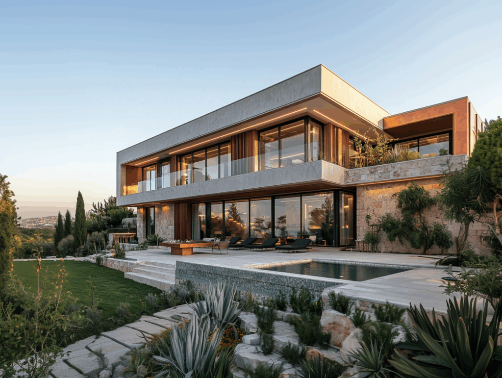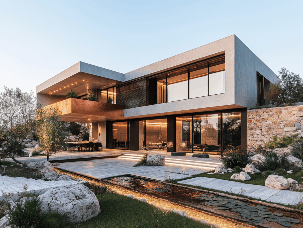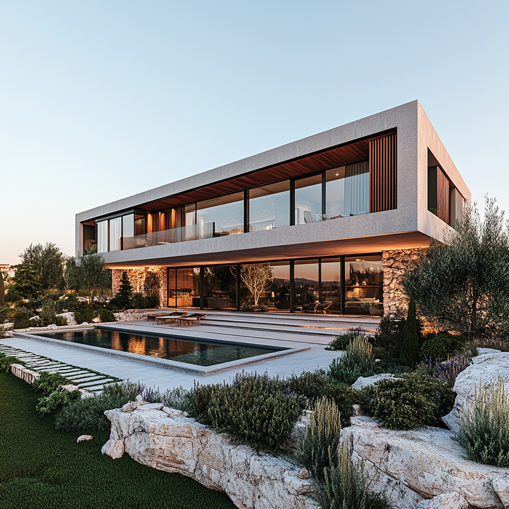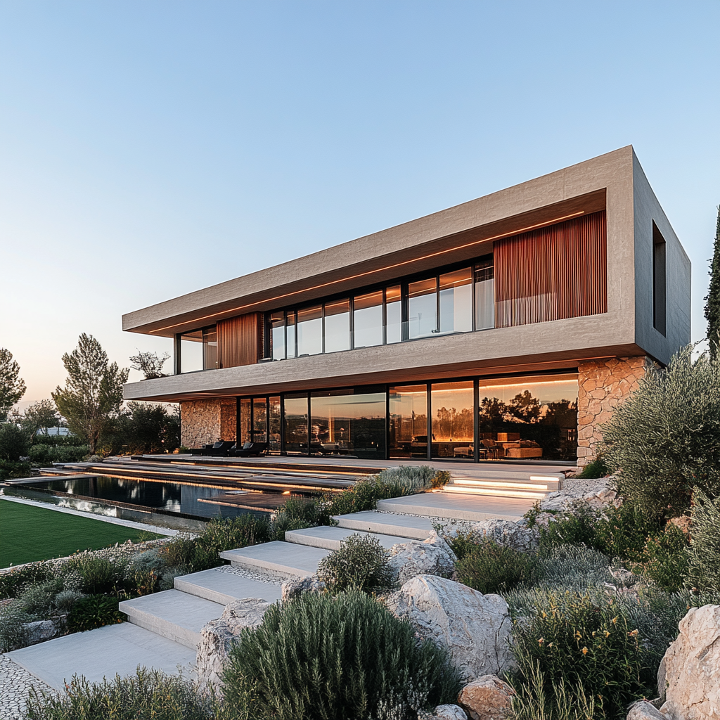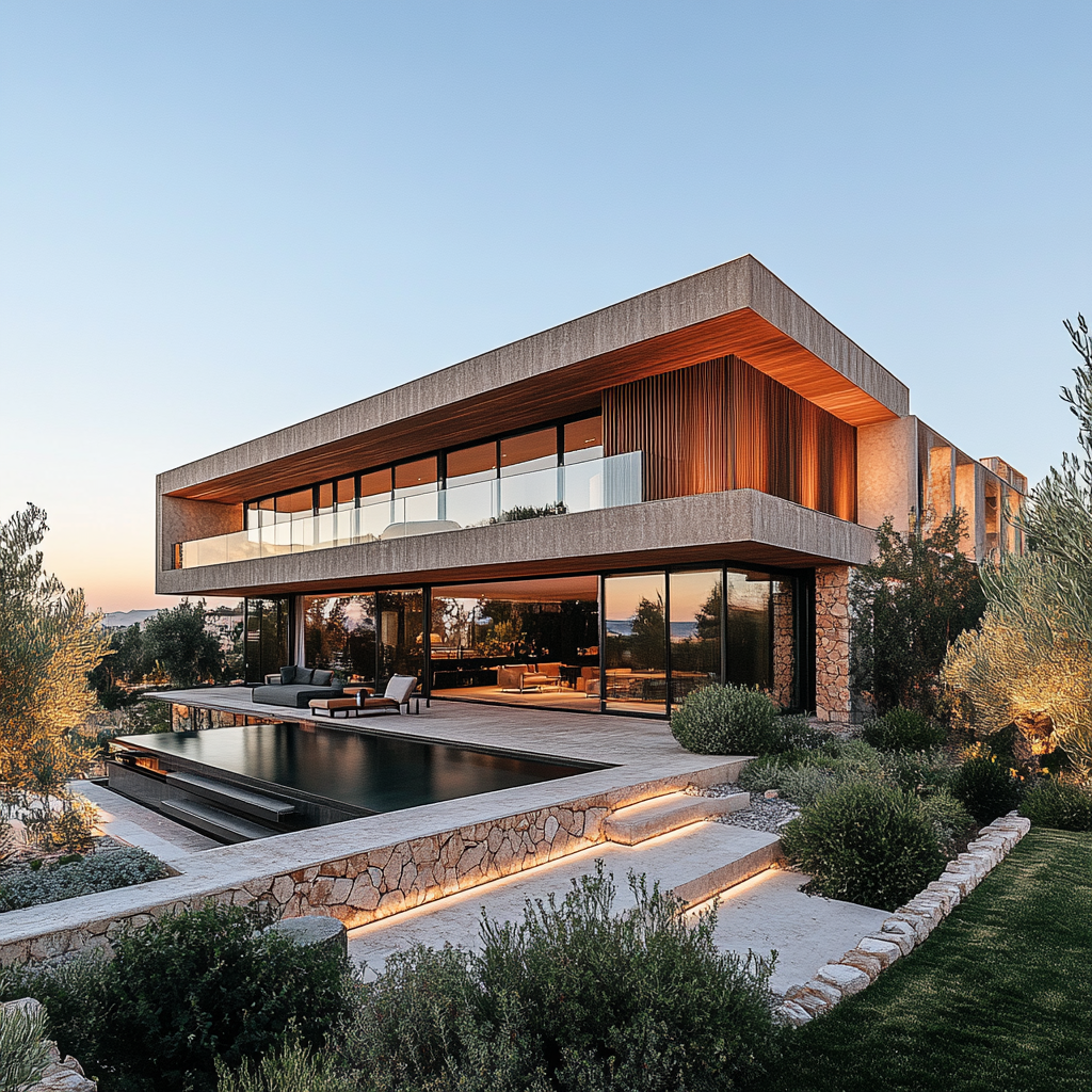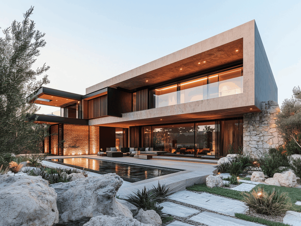 • Cephe Karakteri: Beton ve taşın kontrastı + geniş cam yüzeyler