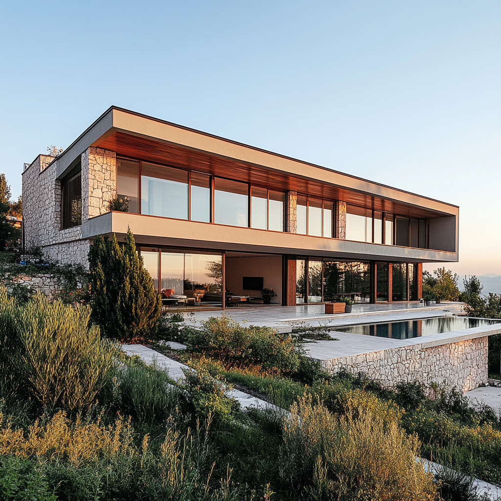 • Yapı Malzemeleri: Betonarme, doğal taş kaplama, cam, ahşap detaylar