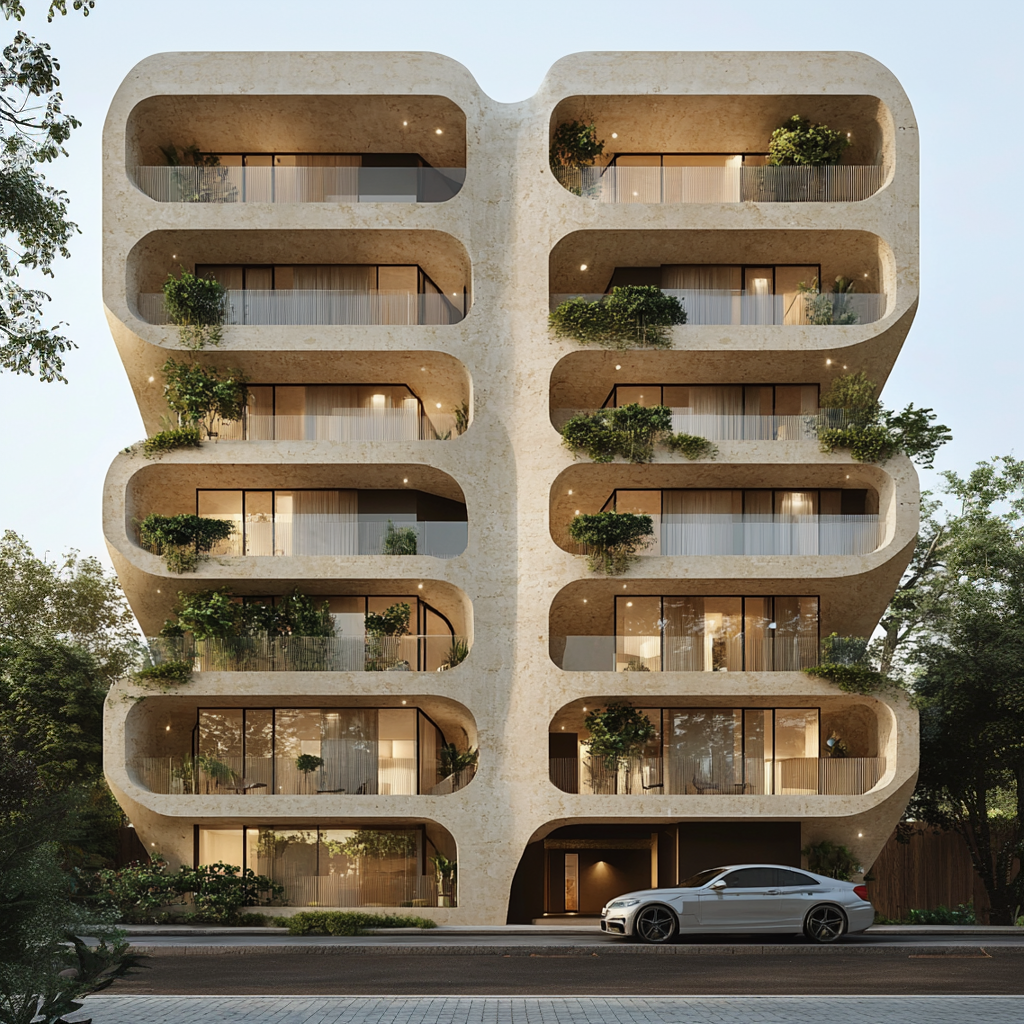 Yapının en dikkat çekici özelliği, kat kat yükselen kavisli balkonların ritmik akışı. Bu formlar, binaya hem akışkanlık hem de yumuşak bir karakter kazandırıyor. Balkon korkulukları ince metal hatlarla şeffaflık sağlarken, entegre edilen peyzaj elemanları cepheyi yaşayan bir organizmaya dönüştürüyor.