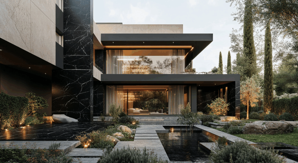 • Yaklaşım: Karanlık tonlu doğal taş yüzeyler ve camın ışığıyla dengelenen, gölge odaklı minimal mimari