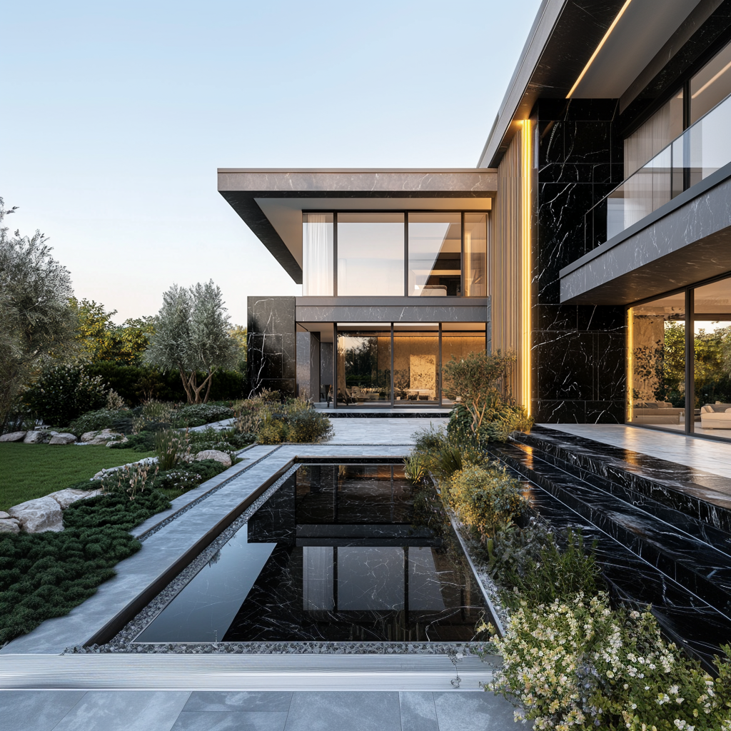 Bahçedeki doğal taş bloklar, minimalist peyzaj kurgusu ile birleşerek sakin ama etkili bir zemin oluşturuyor. Yansıma havuzlarının ışığı taş ve mermer yüzeylere yansıtması, projeye zamansız bir estetik değer katıyor.