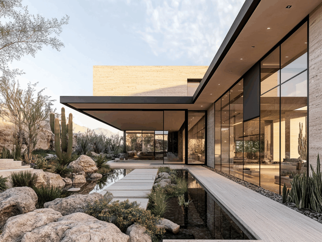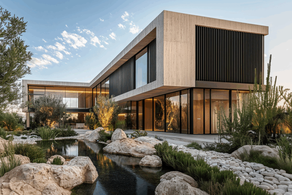 Cephe dili, taşın dokusuyla metal ve camın zarif kontrastını birleştirir; doğal renk paleti, beji, siyahı ve suyun yansıyan mavisini bir araya getirir.
