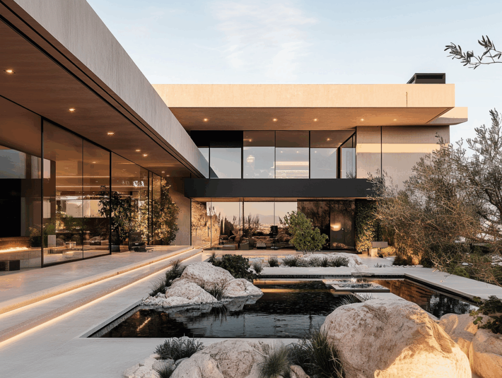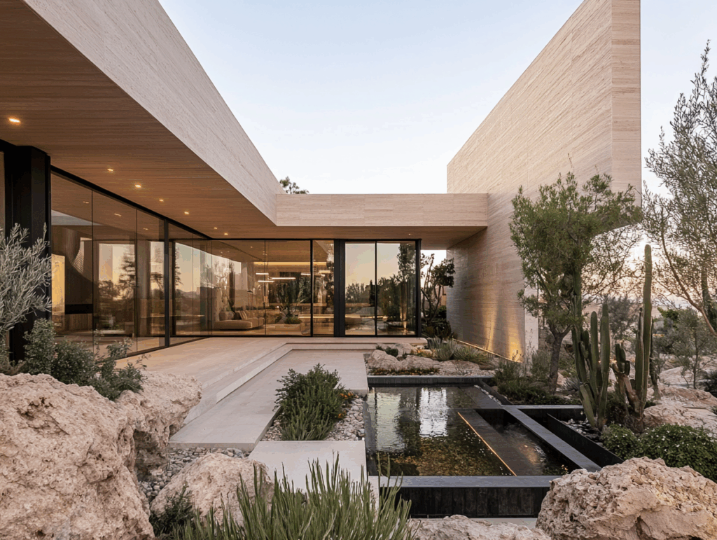 - Yaklaşım: Doğal malzemenin zamansız sadeliğiyle ışığın ve suyun mekânı tanımladığı minimal mimari