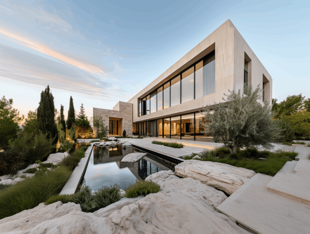 - Peyzaj: Yerel bitki örtüsü (zeytin, lavanta, ardıç) + taş zemin geçişleri + su odaklı yürüyüş aksı