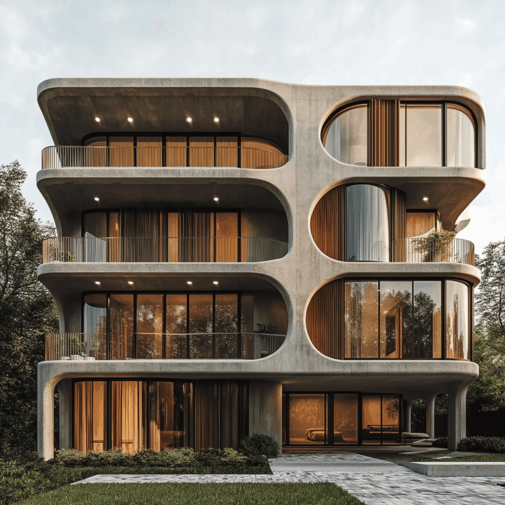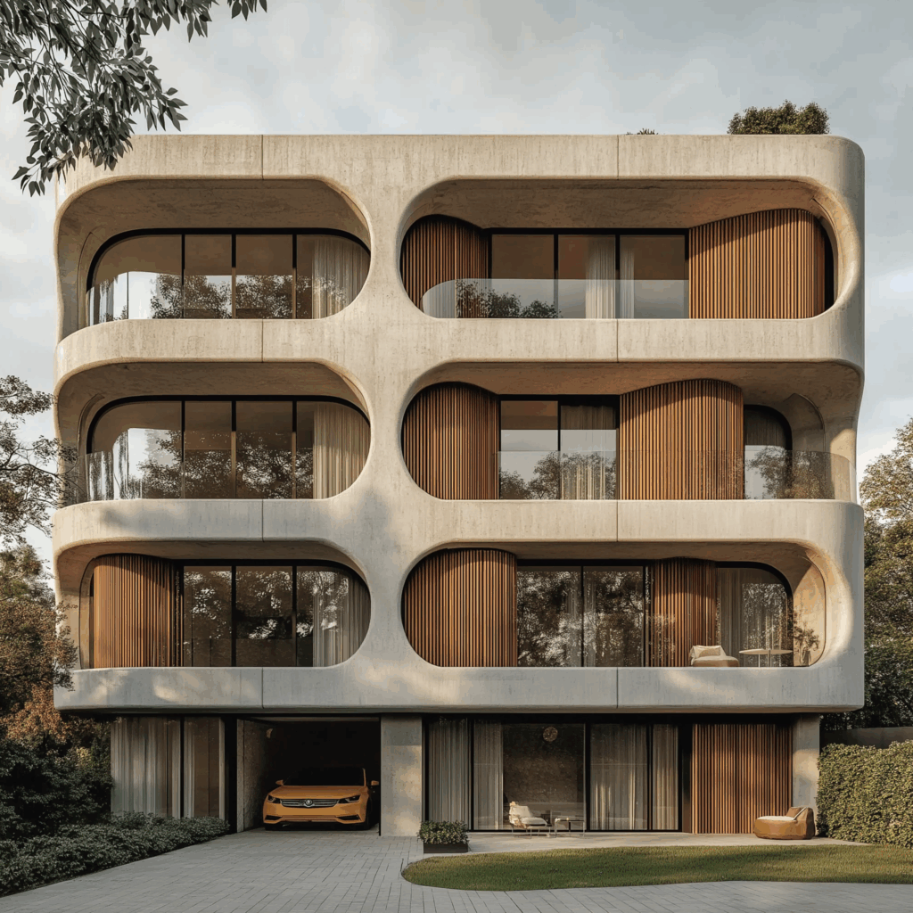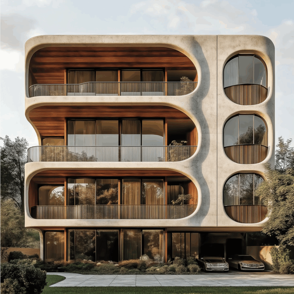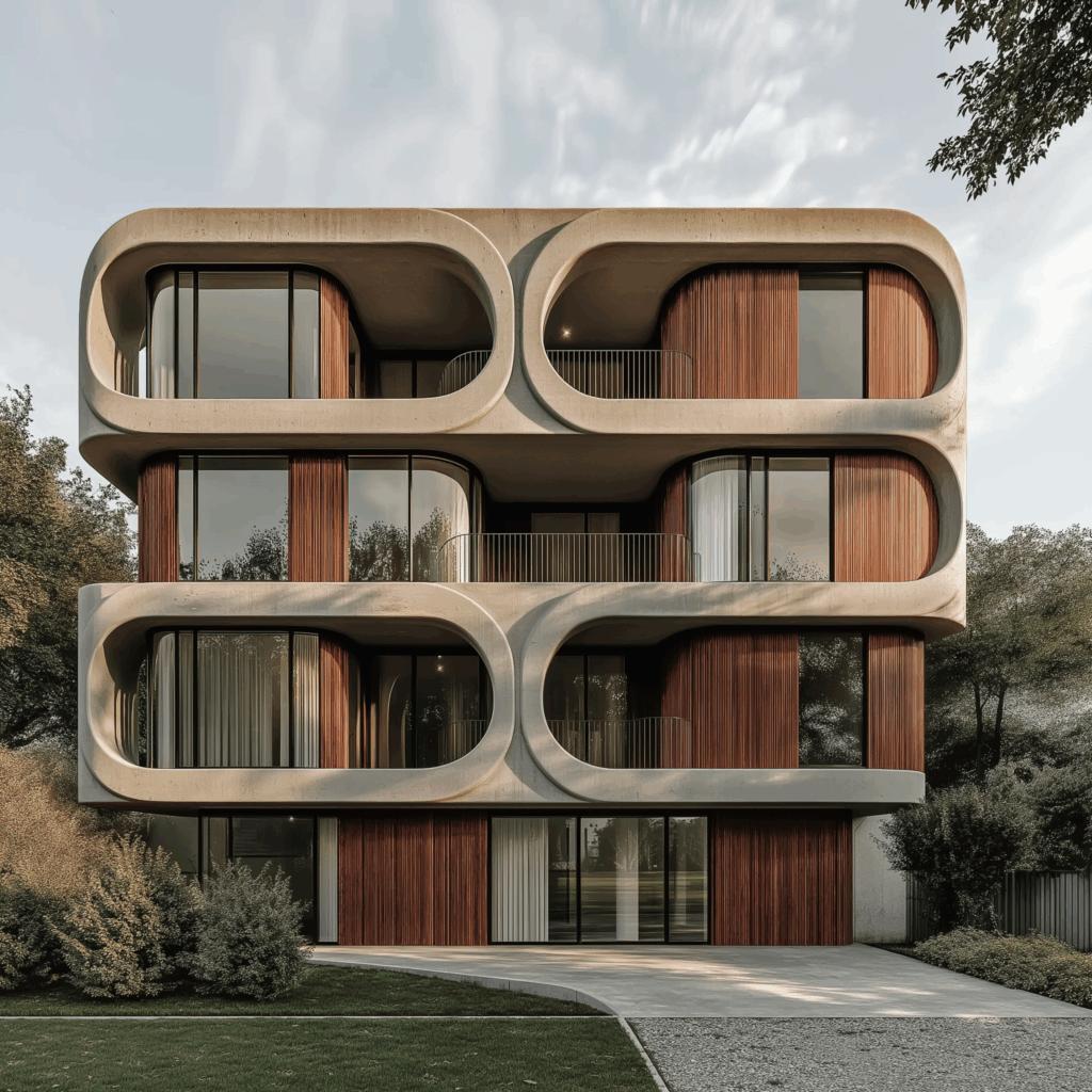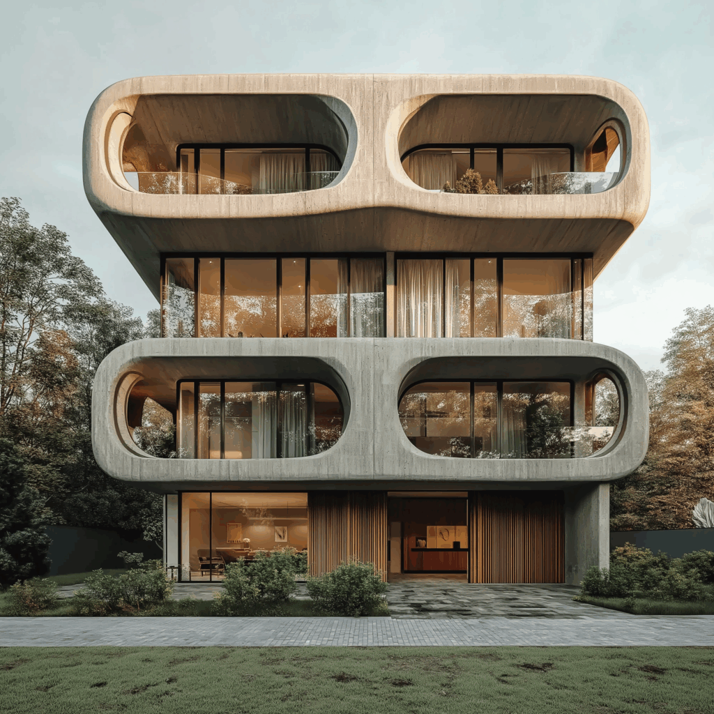 - Cephe Karakteri: Oval açıklıklar + beton yüzeyler + ahşap dokular