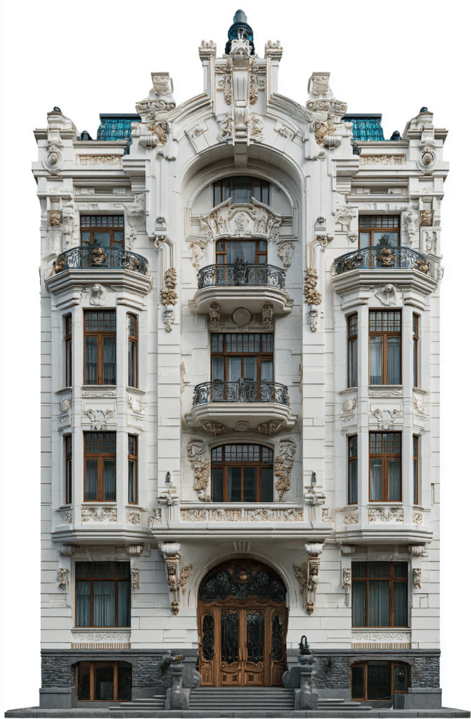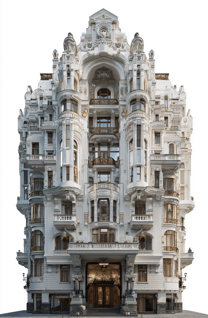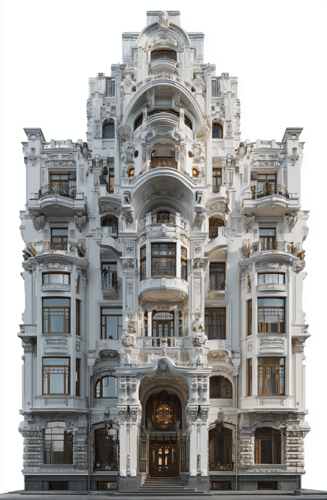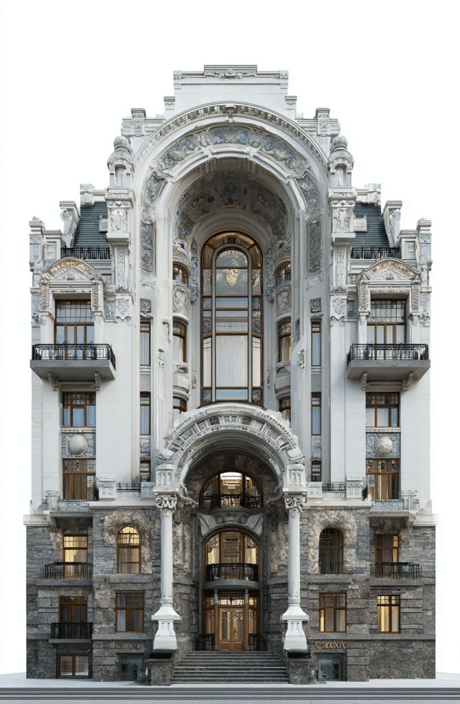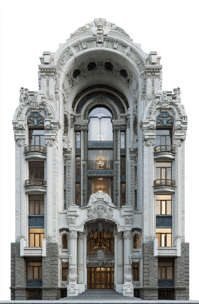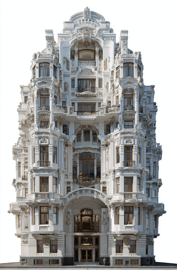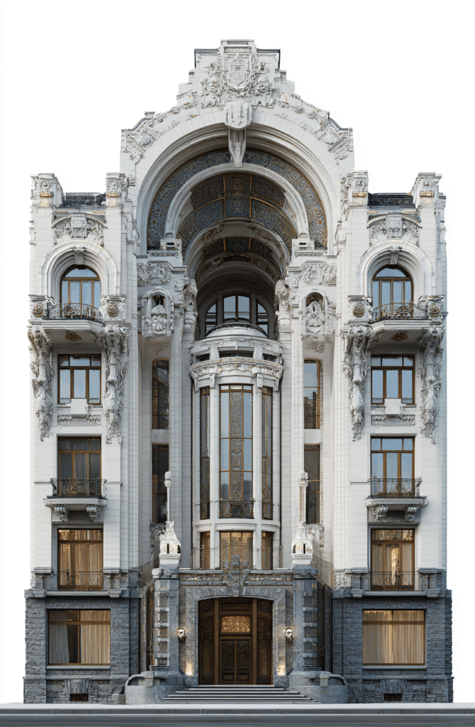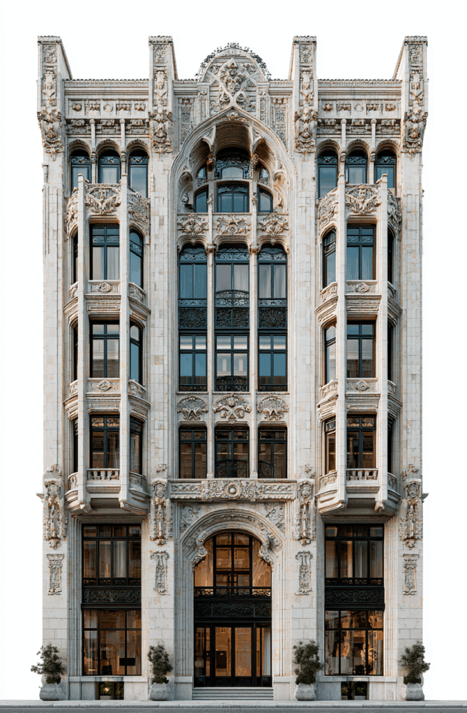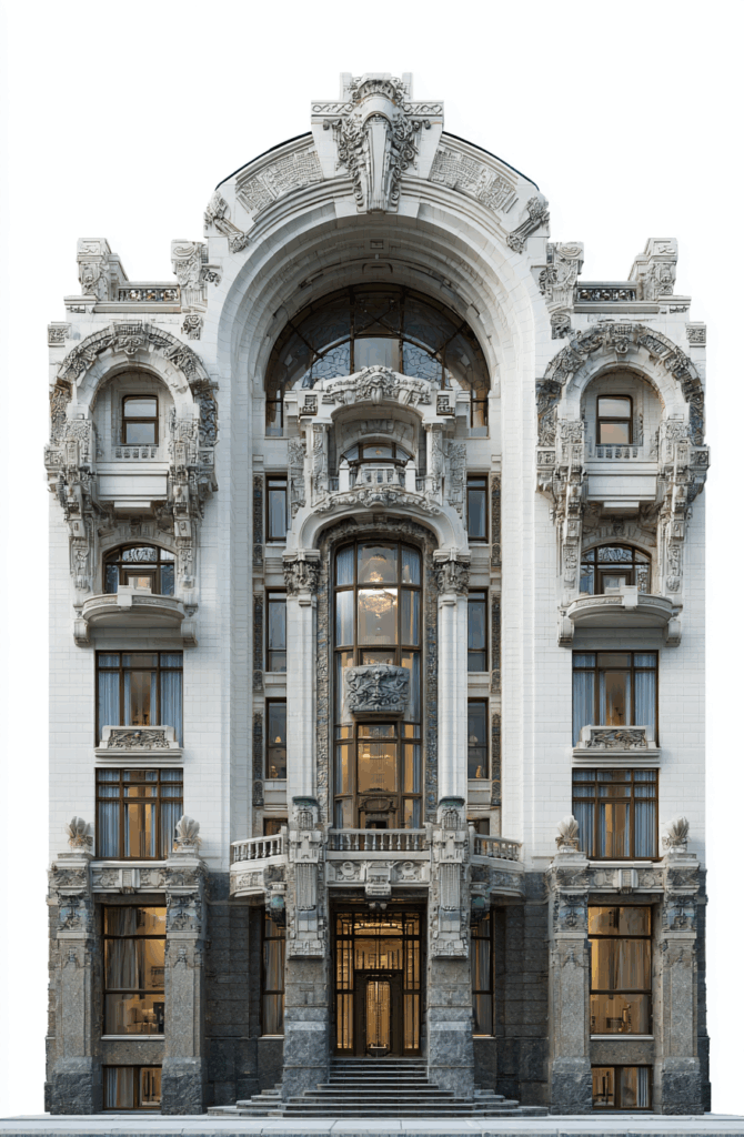 Cephe Karakteri: Organik kıvrımlarla biçimlenmiş klasik cephe; ışıkta derinleşen dekoratif yüzeyler