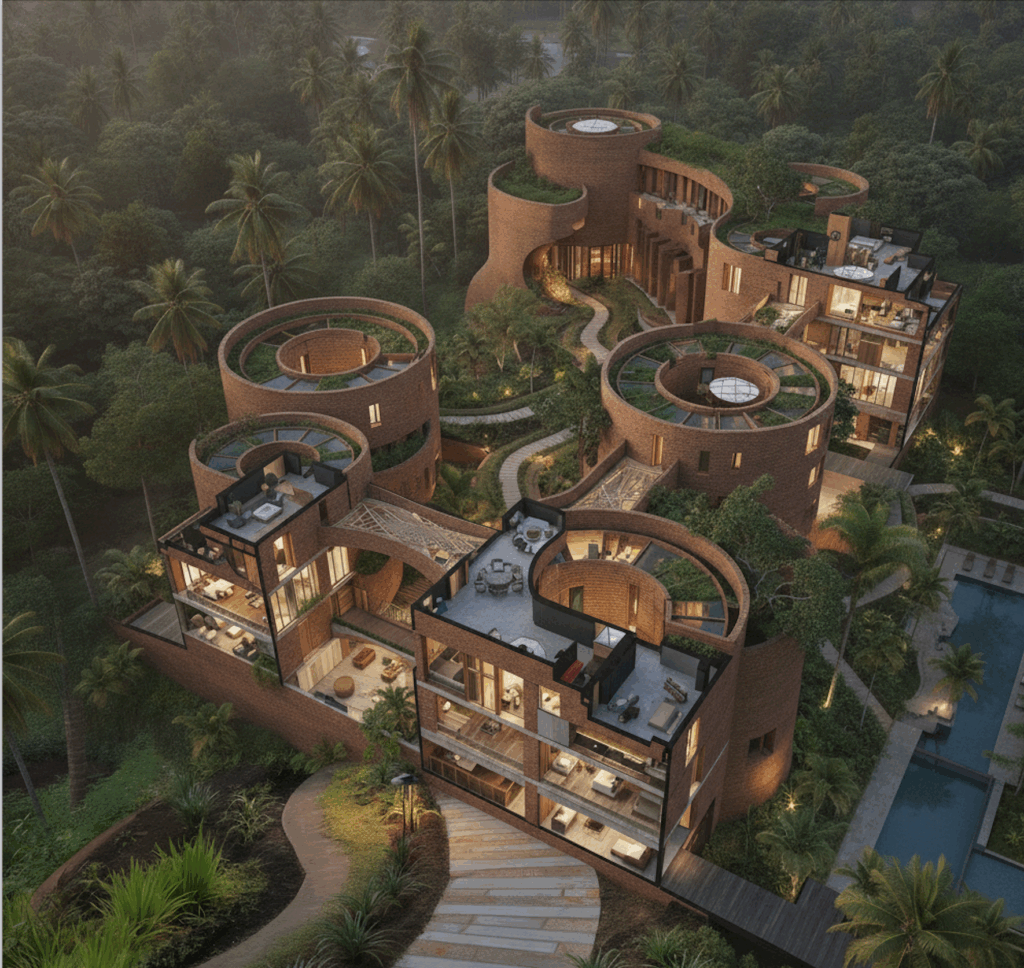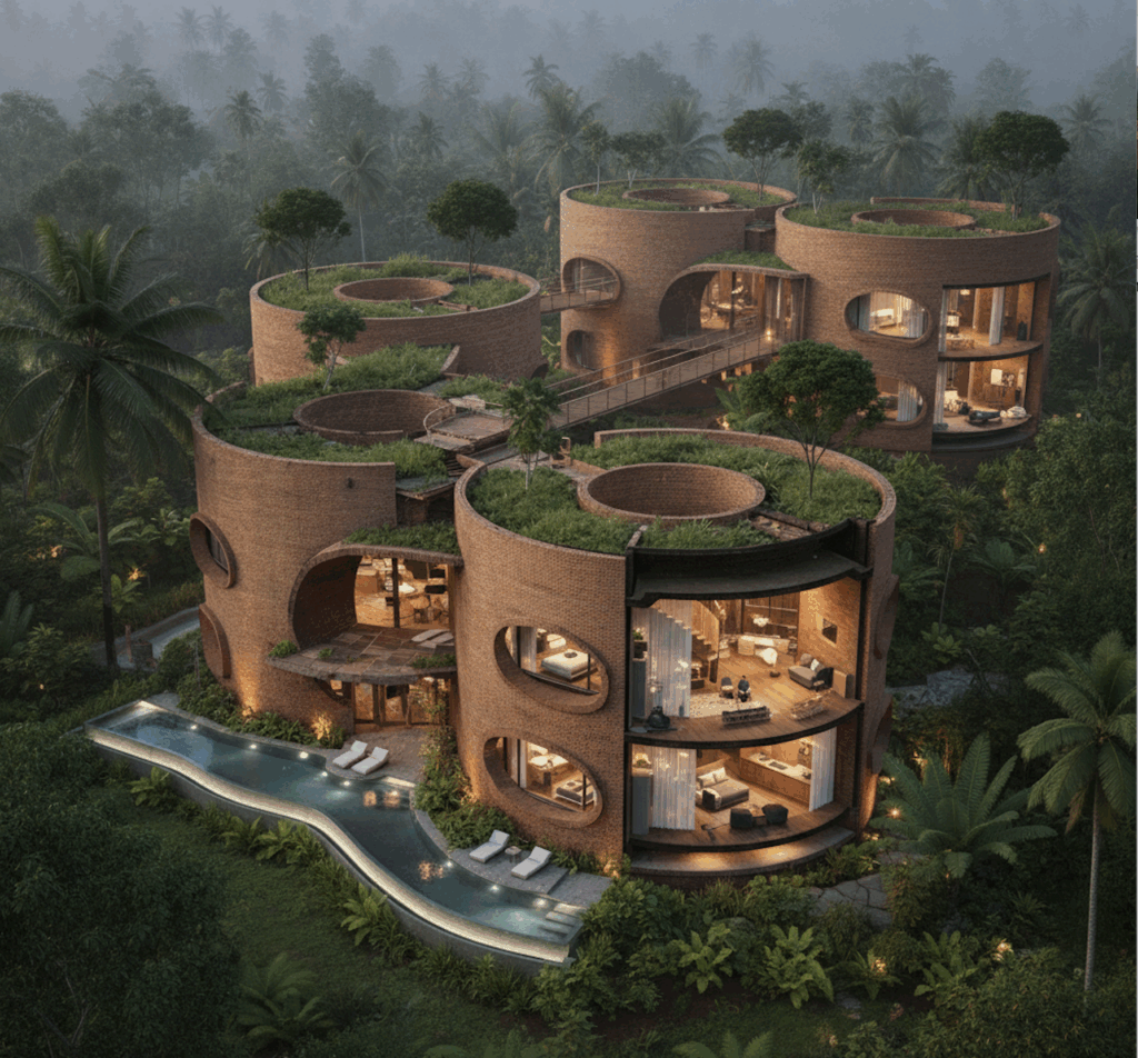 • Bağlam: Tropikal orman ekosistemi içinde kavisli, biyofilik yapı kümelenmesi