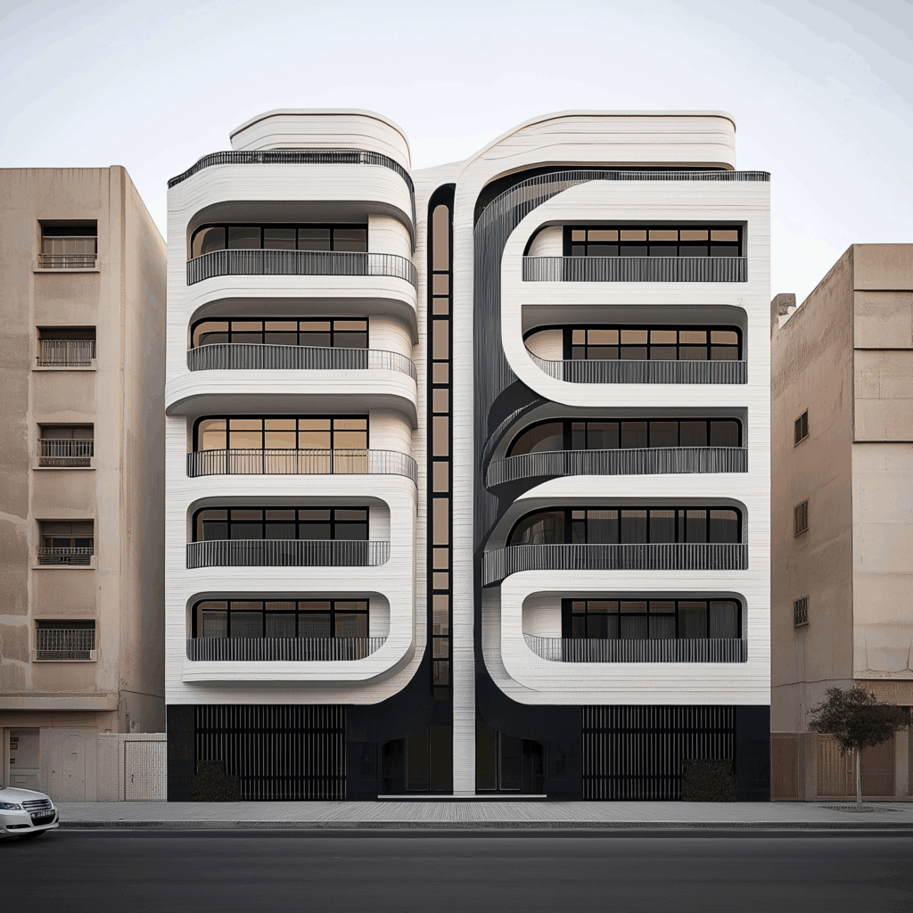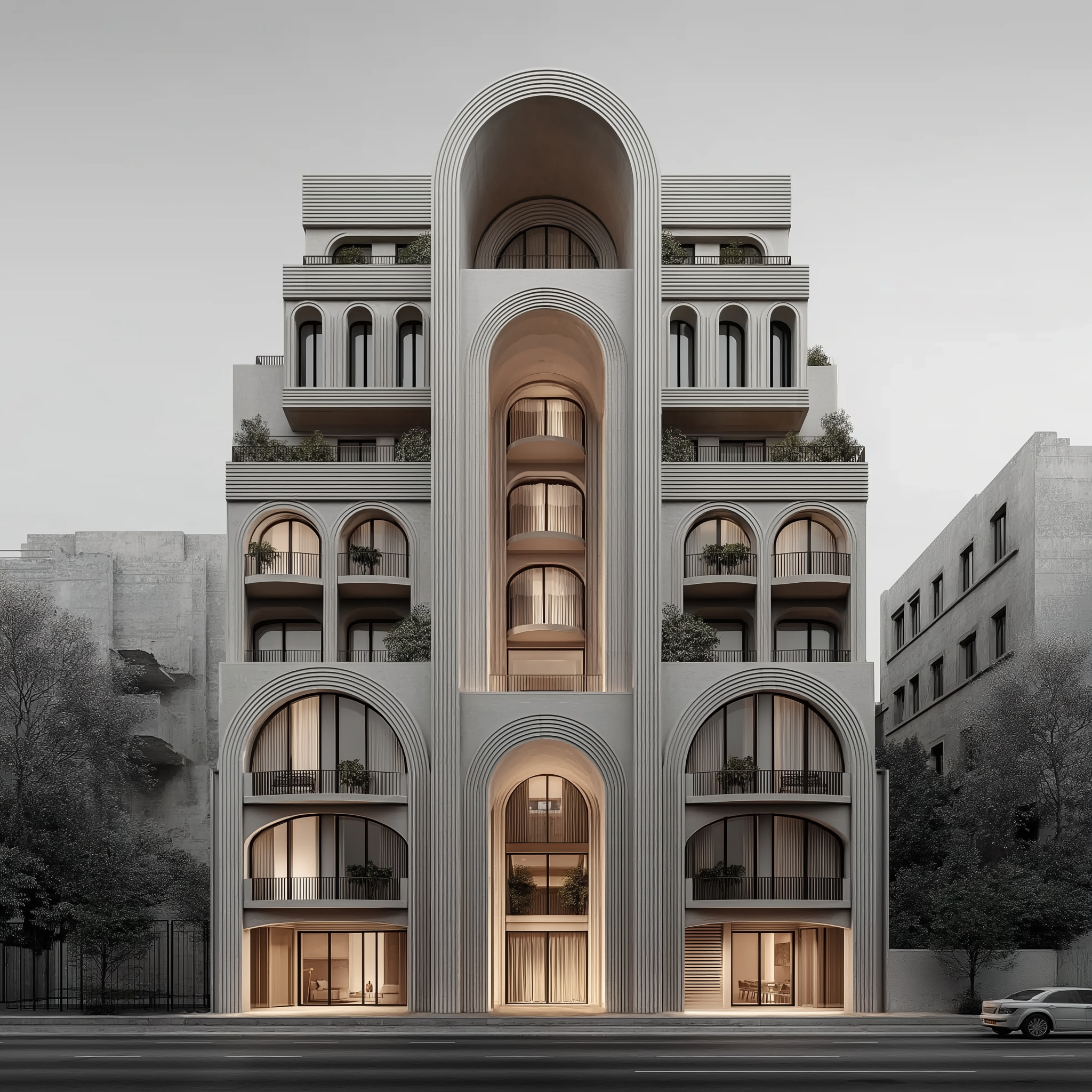 Yumuşak kemer hatlarının betonarme yüzeylerle bütünleştiği cephe düzeni, kentin sert siluetine ritmik bir yumuşaklık kazandırıyor.