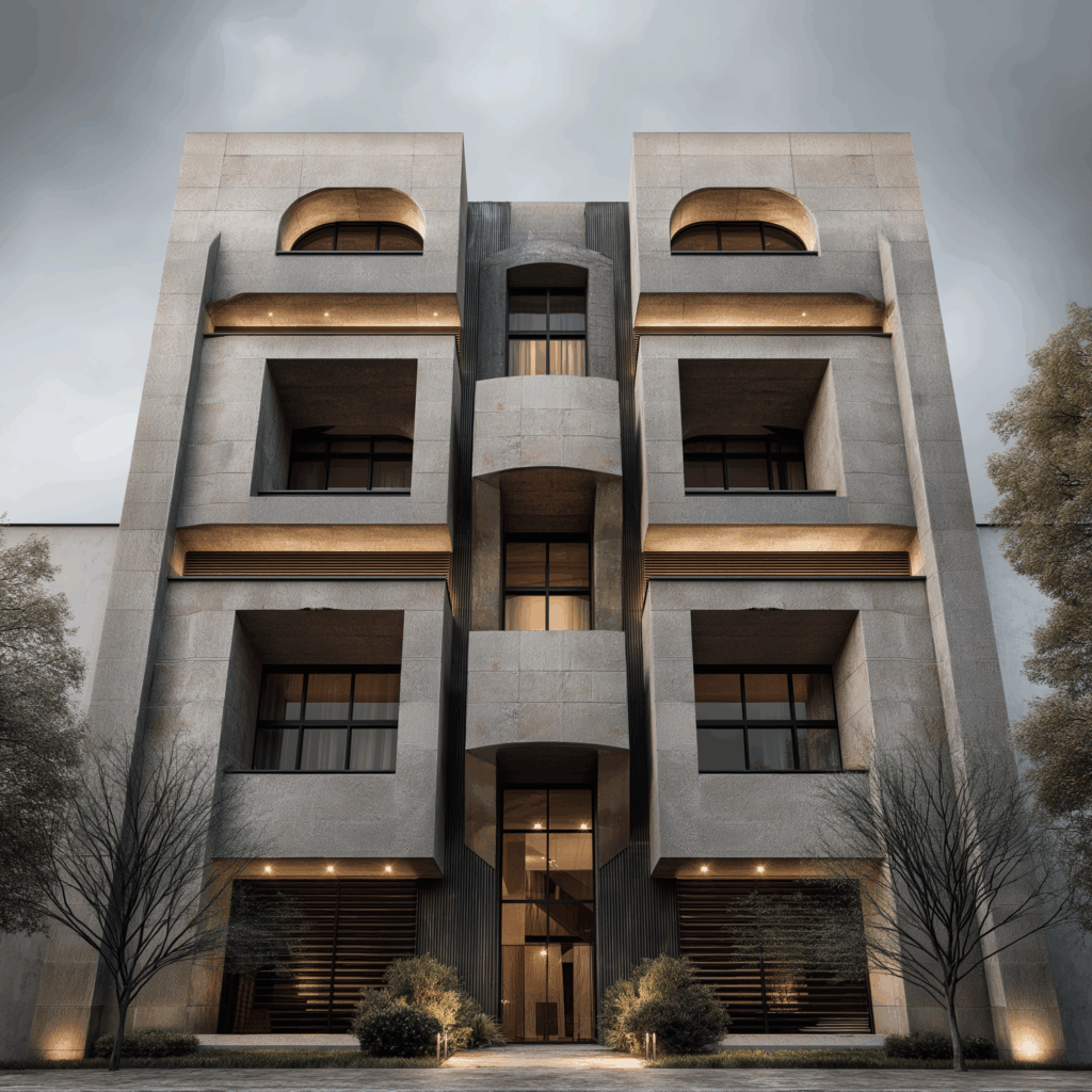 - Yaklaşım: Katmanlı geometrik derinlik, monolitik taş malzeme, ritmik cephe dengesi