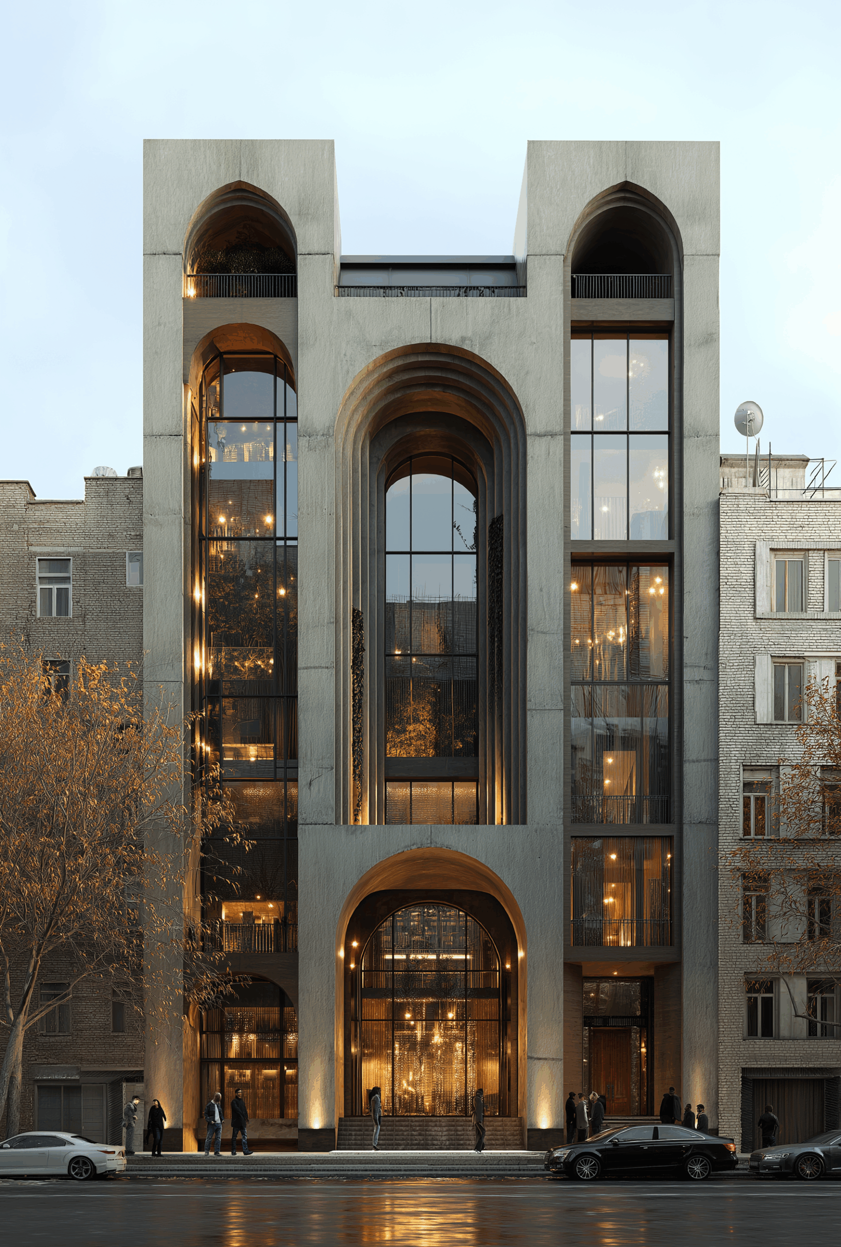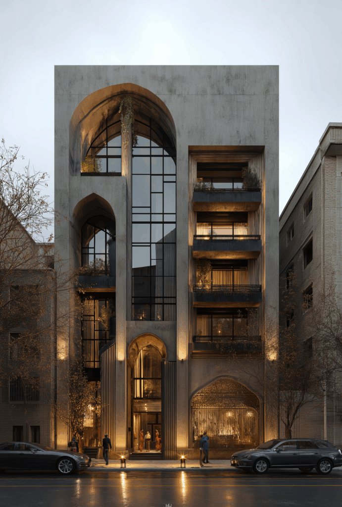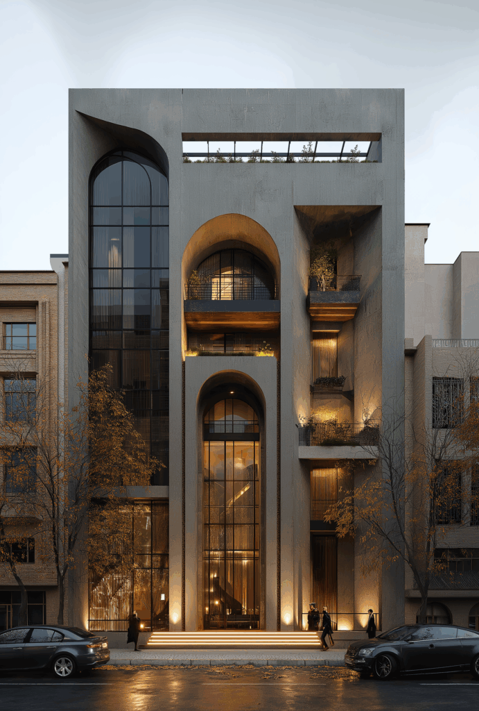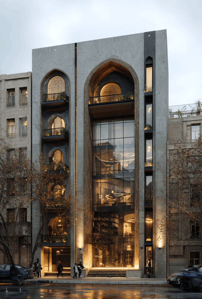 Cephe Elemanları: Gömülü kemer açıklıkları + doğal taş dokular + metal çerçeve