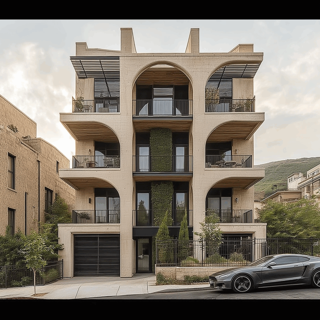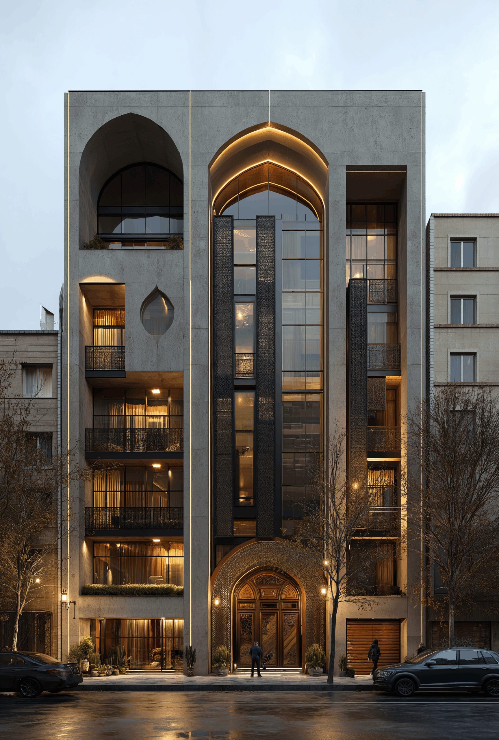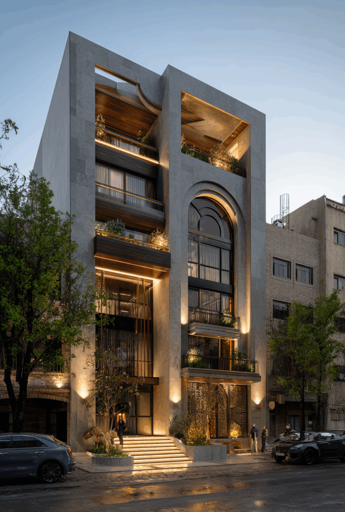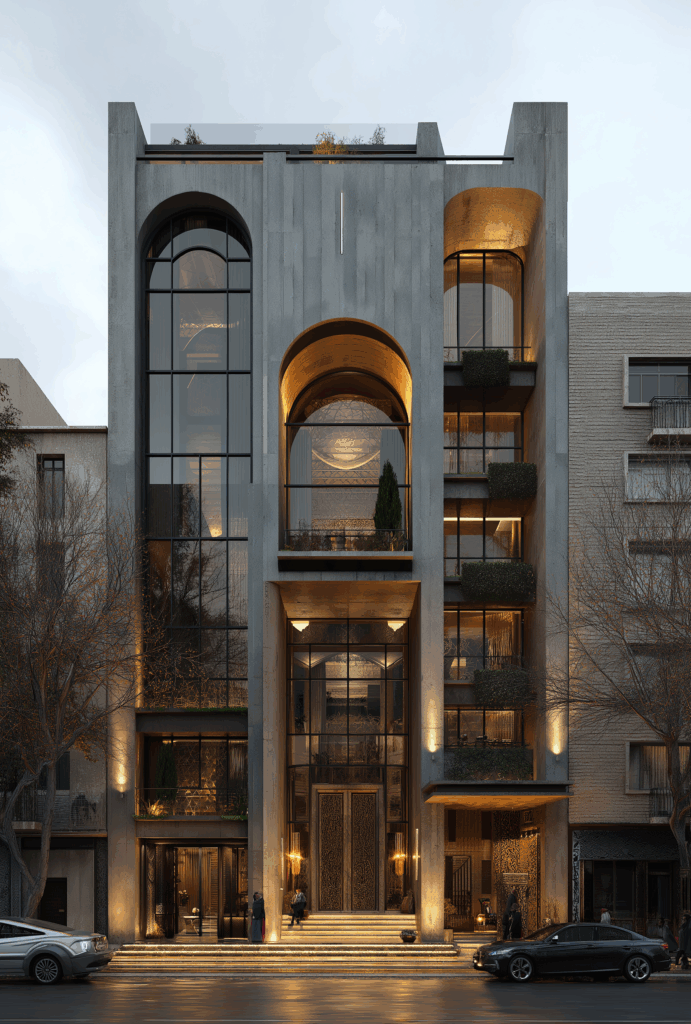 Cephe Elemanları: Gömülü kemer açıklıkları + doğal taş dokular + metal çerçeve