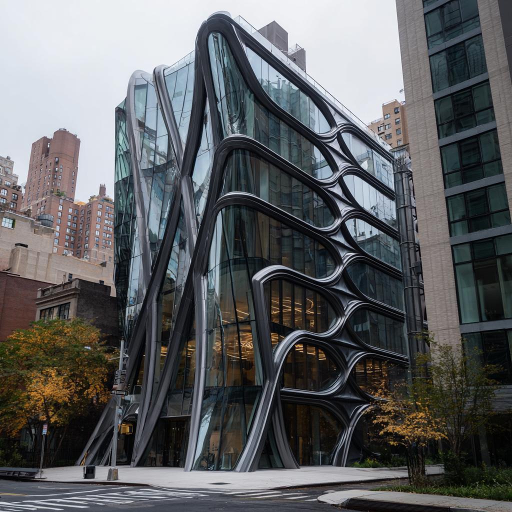 - Bağlam: Yoğun kent dokusu içinde doğayı taklit eden akışkan yüzey geometrisiyle “biyonik zeka” estetiğini temsil eder.