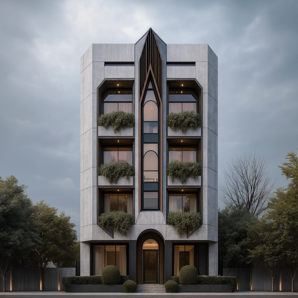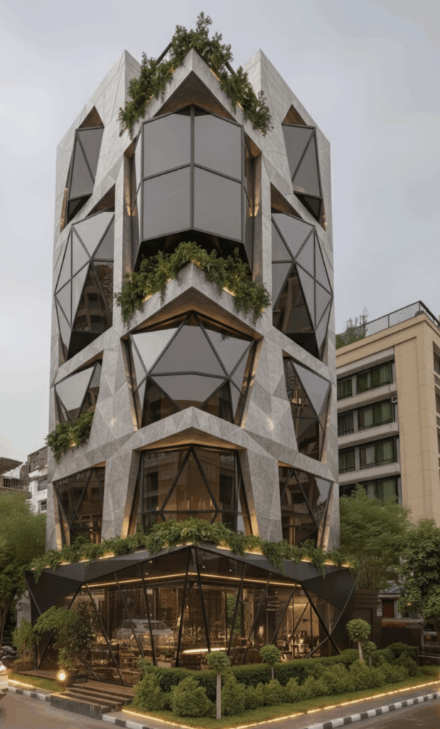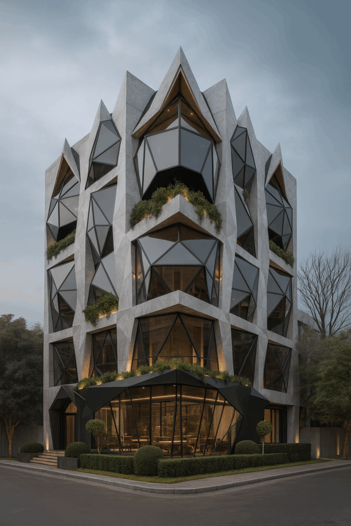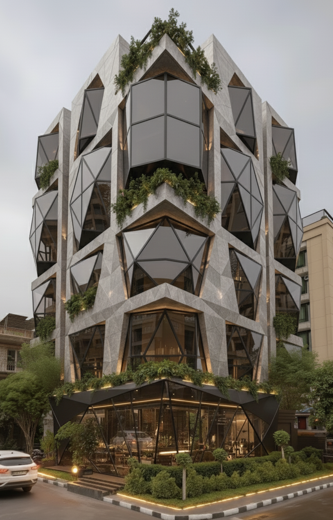 Cephe Karakteri: Dikey ritim, üçgen kırılımlar, organik peyzaj kontrastı