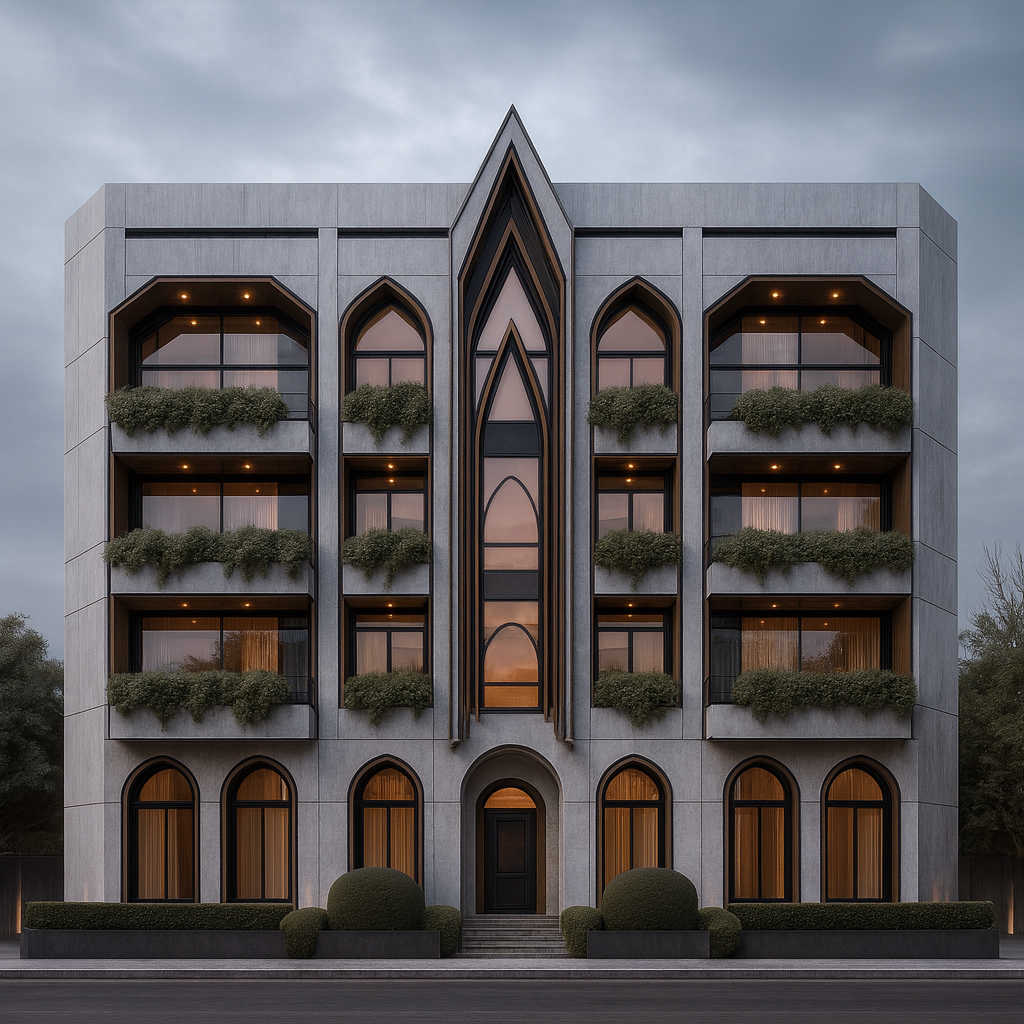 Cephe formu, sivri kemerler ve köşeli geometriler üzerinden ışığın dramatik etkisini yeniden inşa eder.