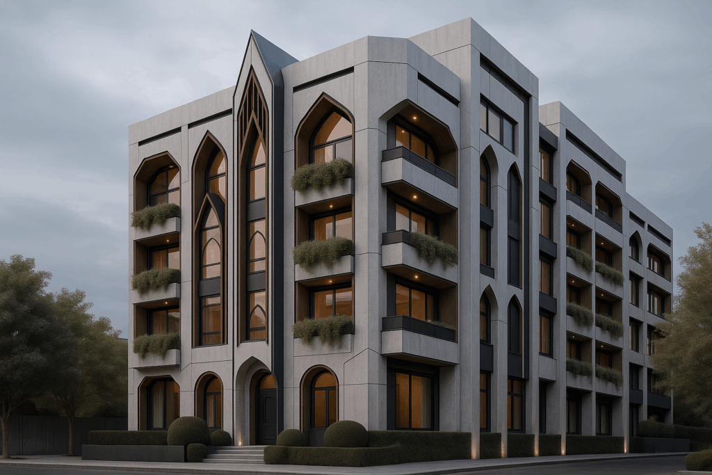 Yapı, gotik mimarinin düşeyliğini çağdaş bir minimalizmle yeniden yorumlayan bir konut kompleksi olarak tasarlandı.