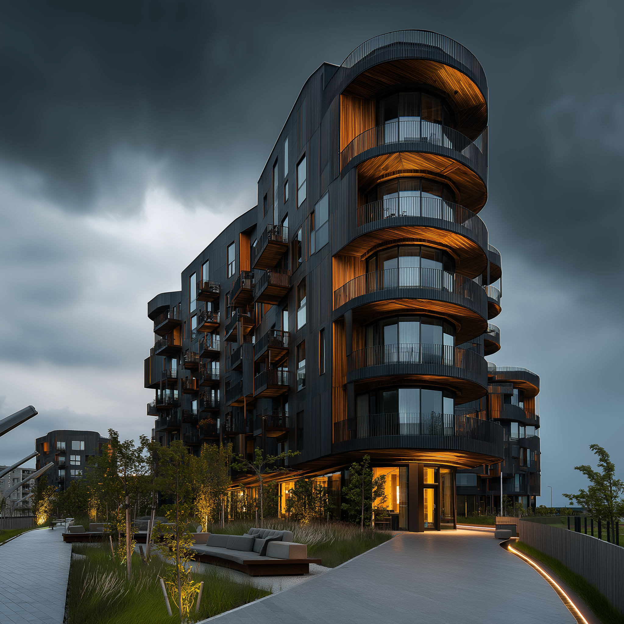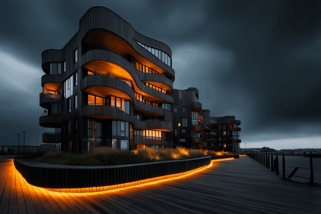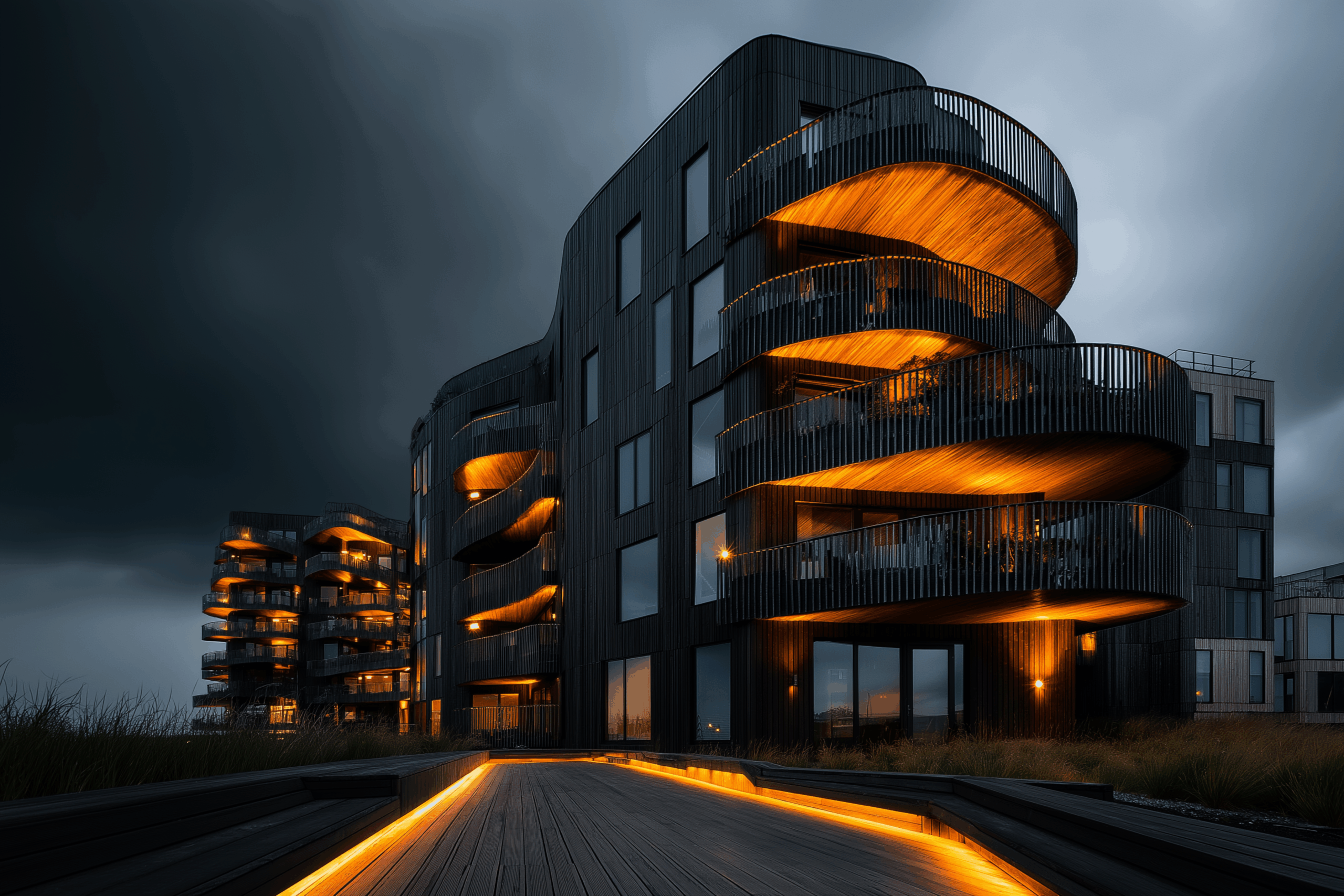 “AmberWave Residences”, doğanın dalga hareketlerinden ilham alan, karanlık ahşap cepheleri amber tonlu ışıkla canlandıran bir sahil konut projesidir.