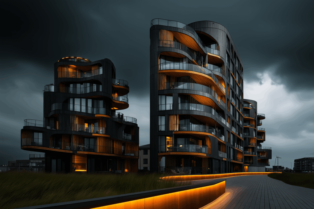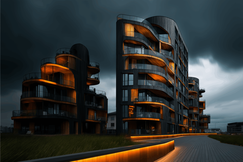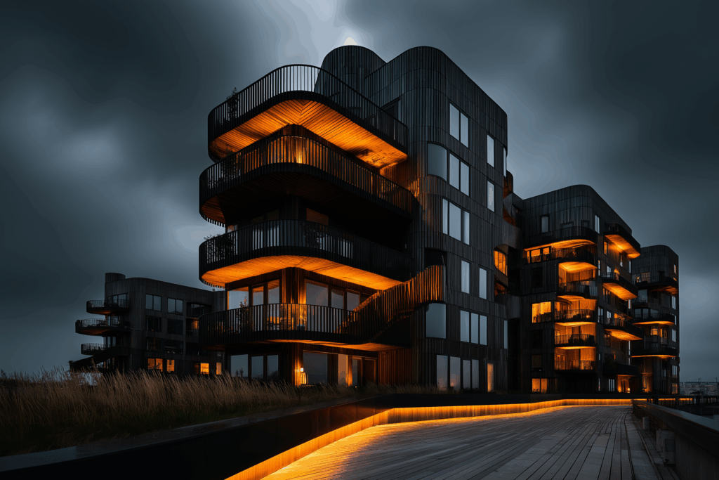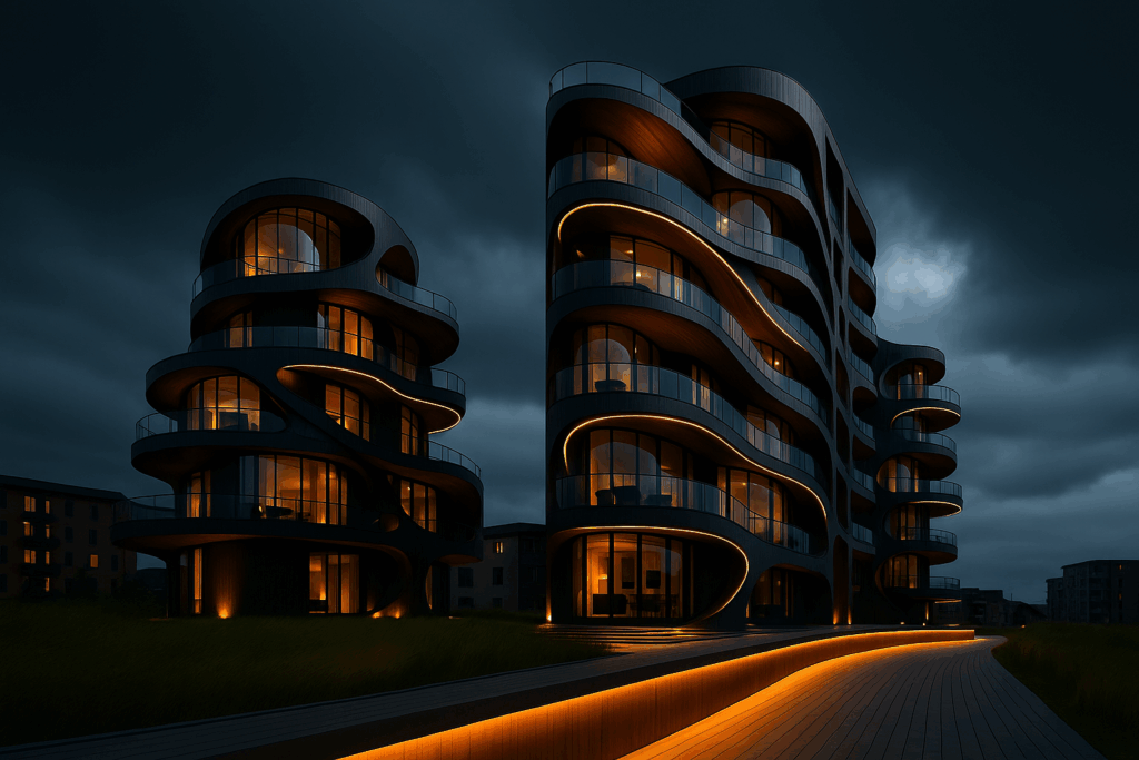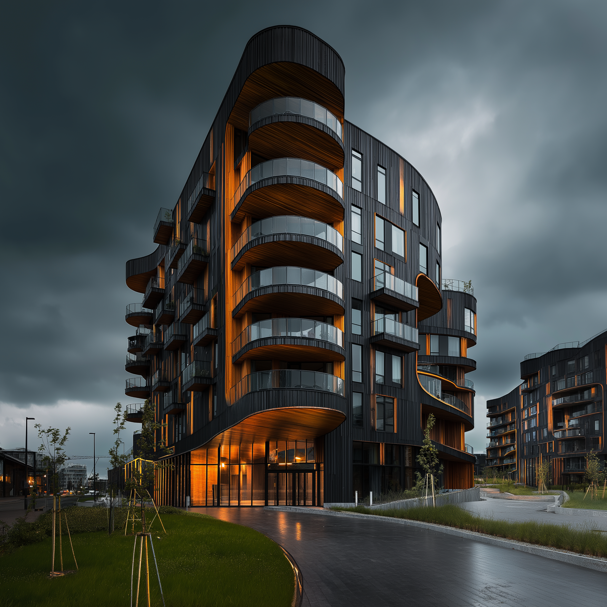 “AmberWave Residences”, doğanın dalga hareketlerinden ilham alan, karanlık ahşap cepheleri amber tonlu ışıkla canlandıran bir sahil konut projesidir.