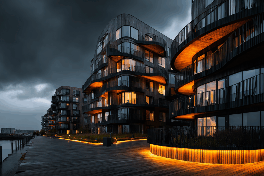 - Bağlam: Liman hattı boyunca uzanan, doğal ışık ve su yansımalarıyla etkileşimli konut kütlesi