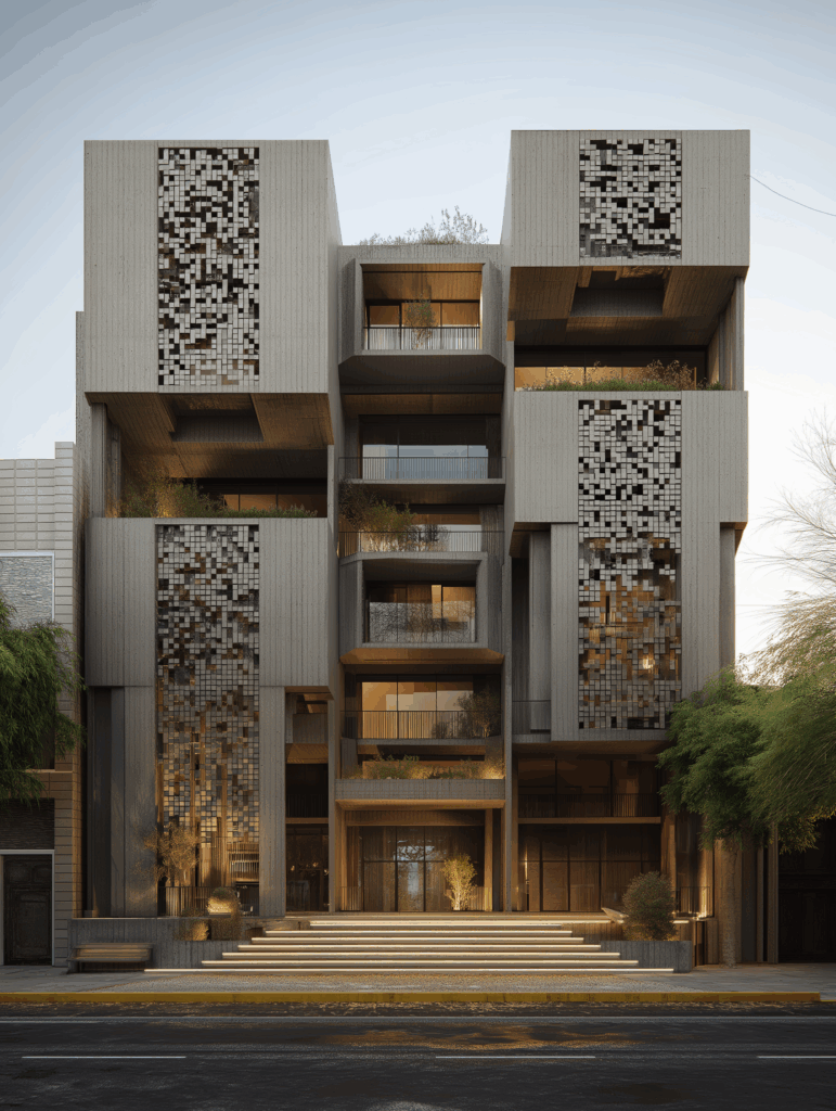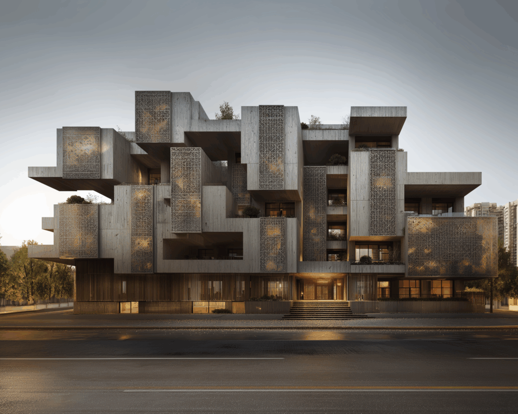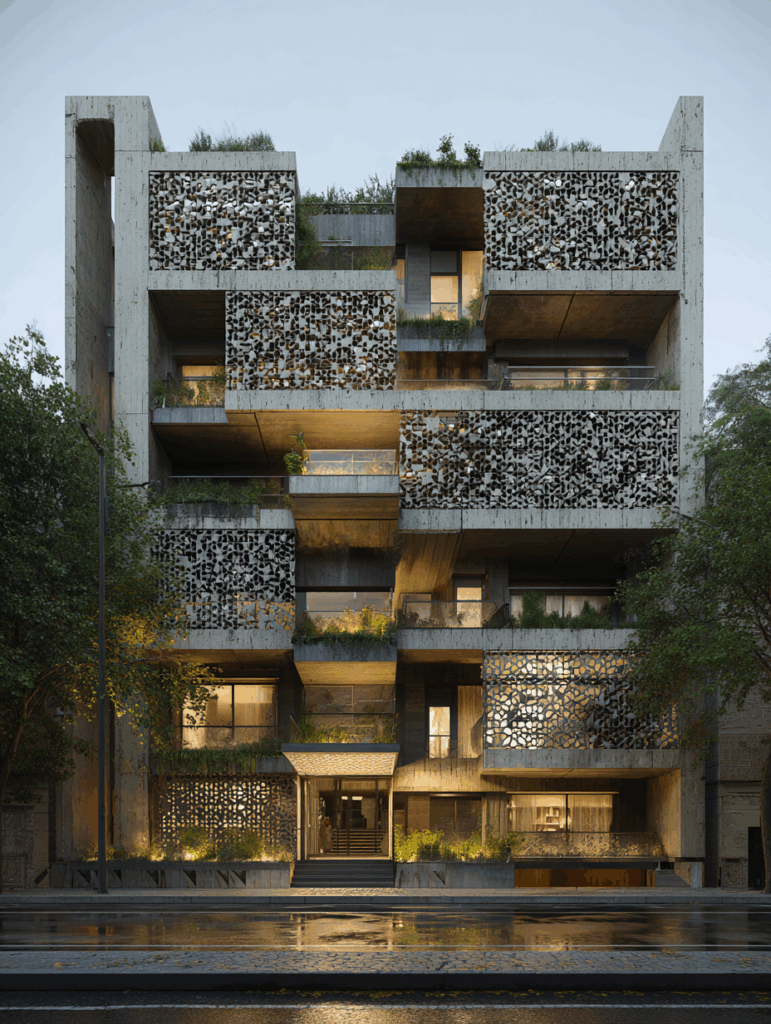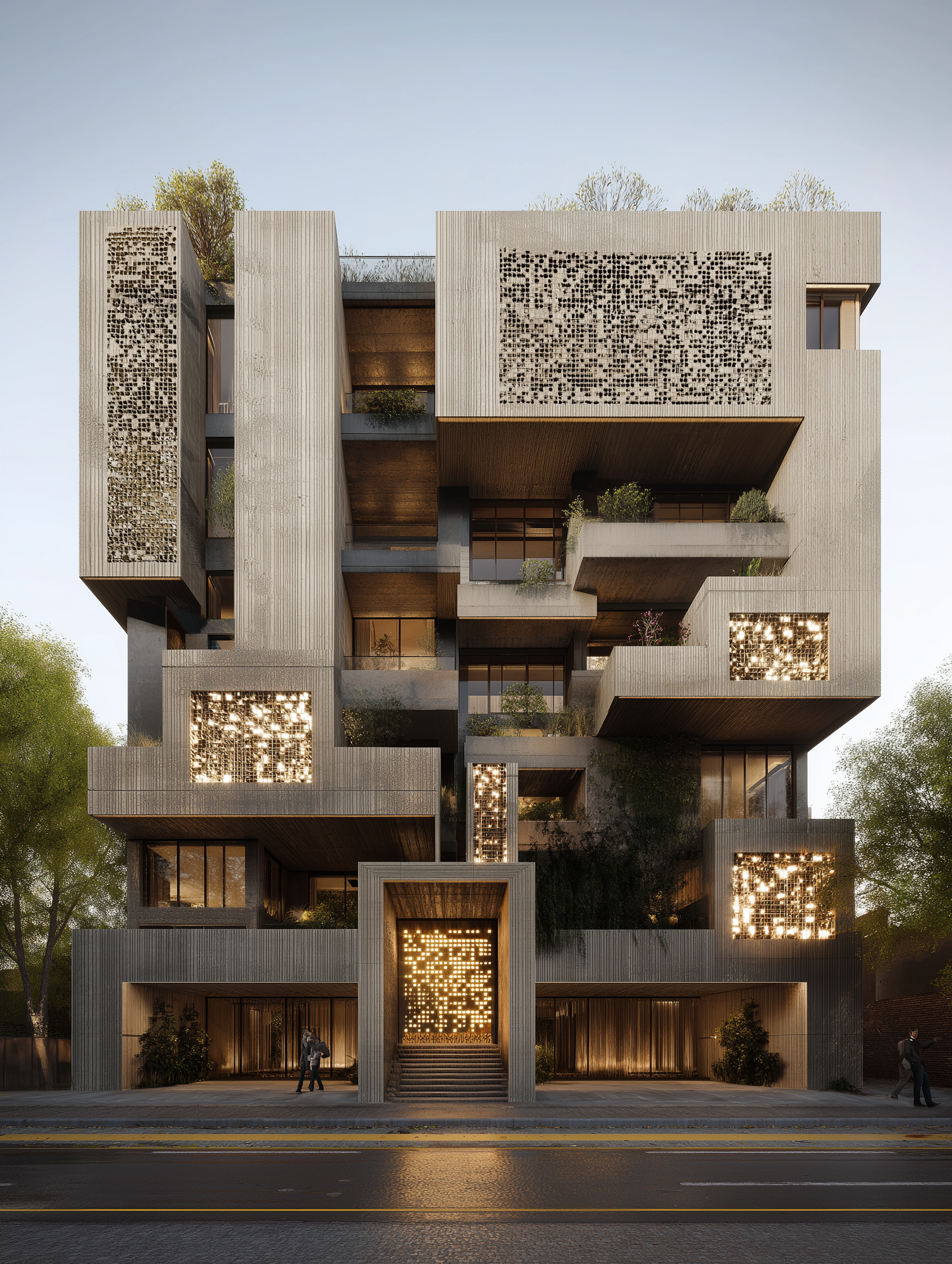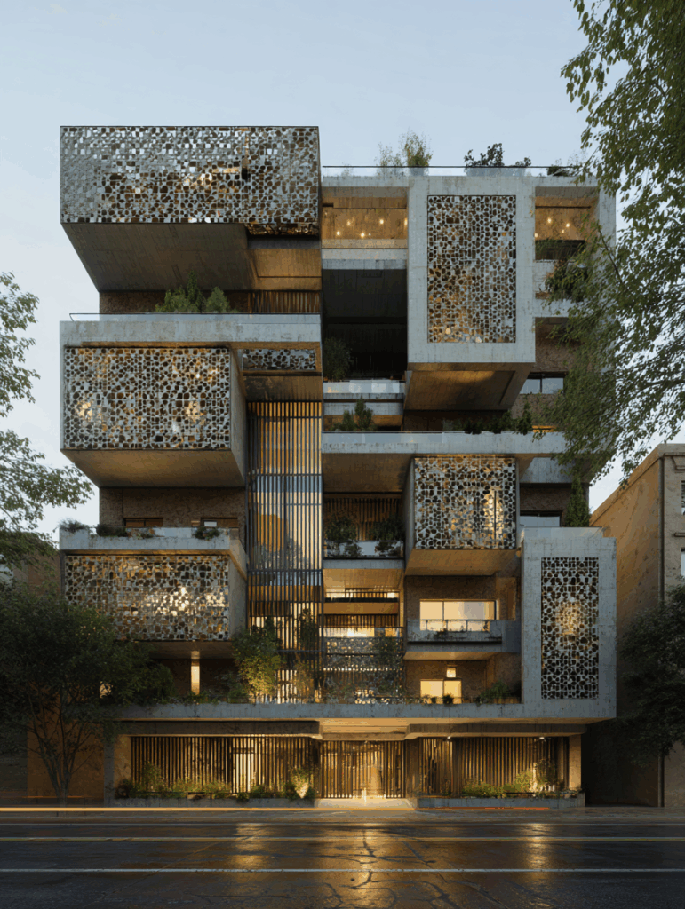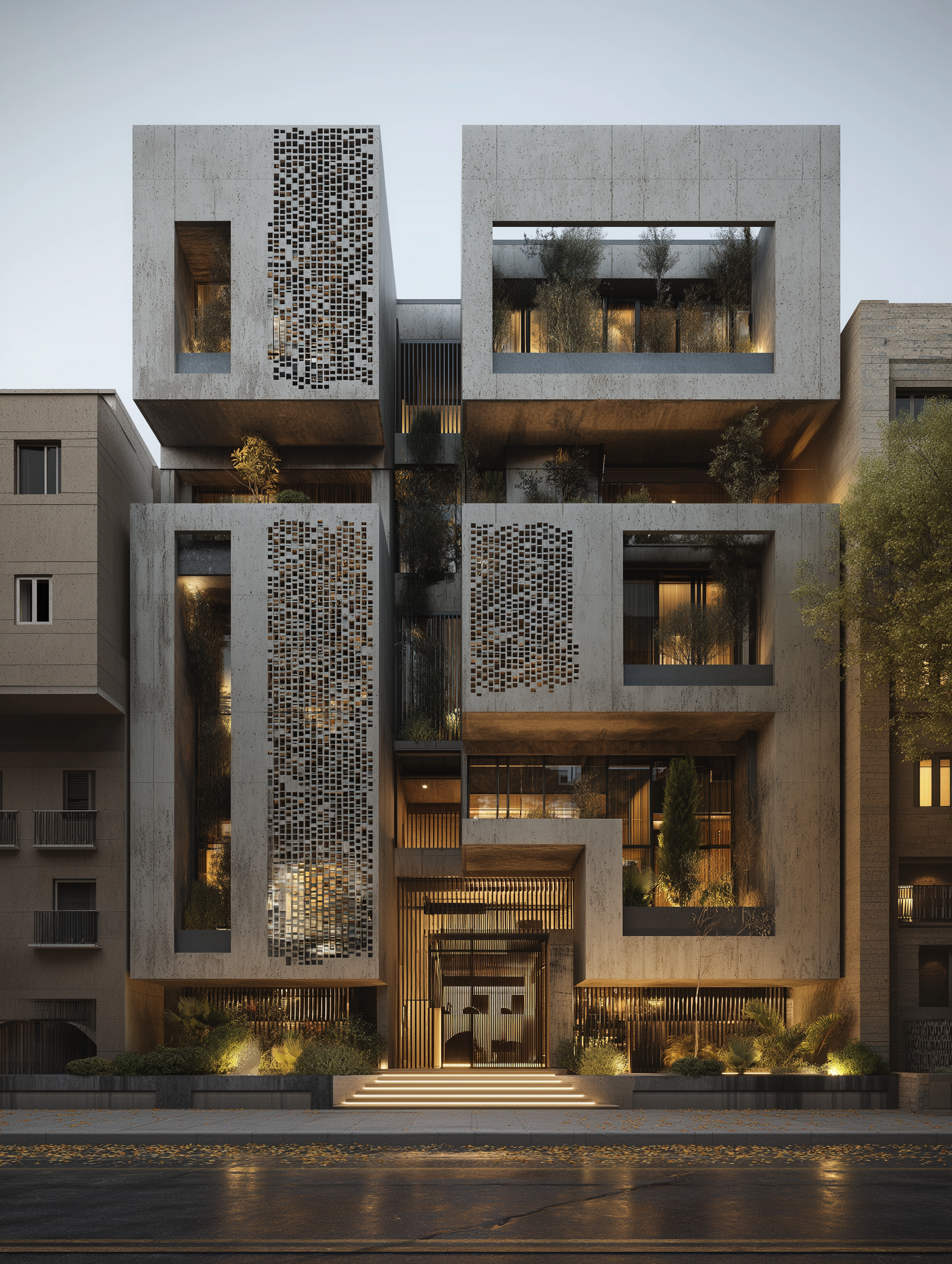 • Cephe Kaplaması: Ham beton + perfore metal paneller