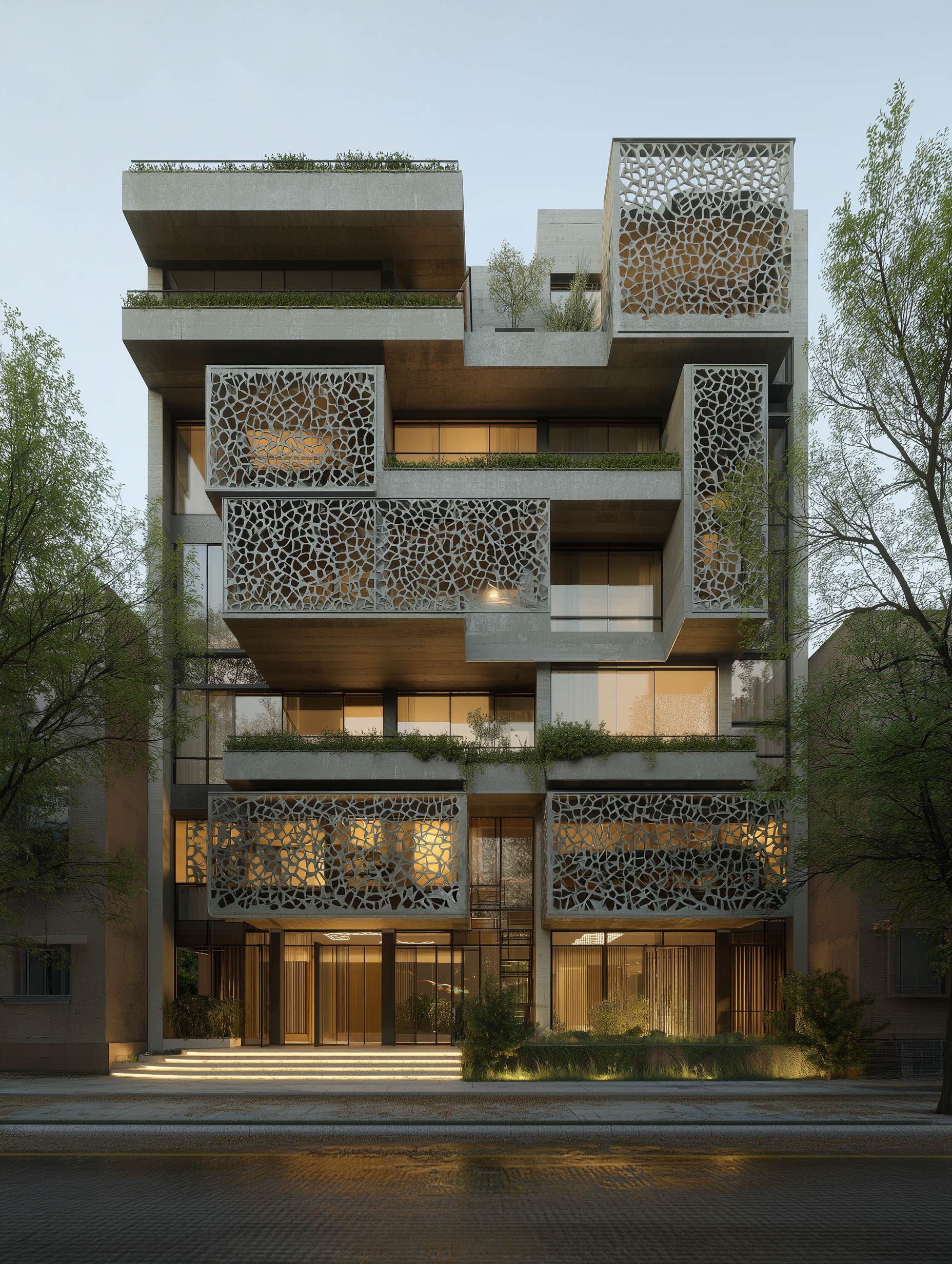 • Cephe: Beton kabuk + lazer kesim metal desen paneller