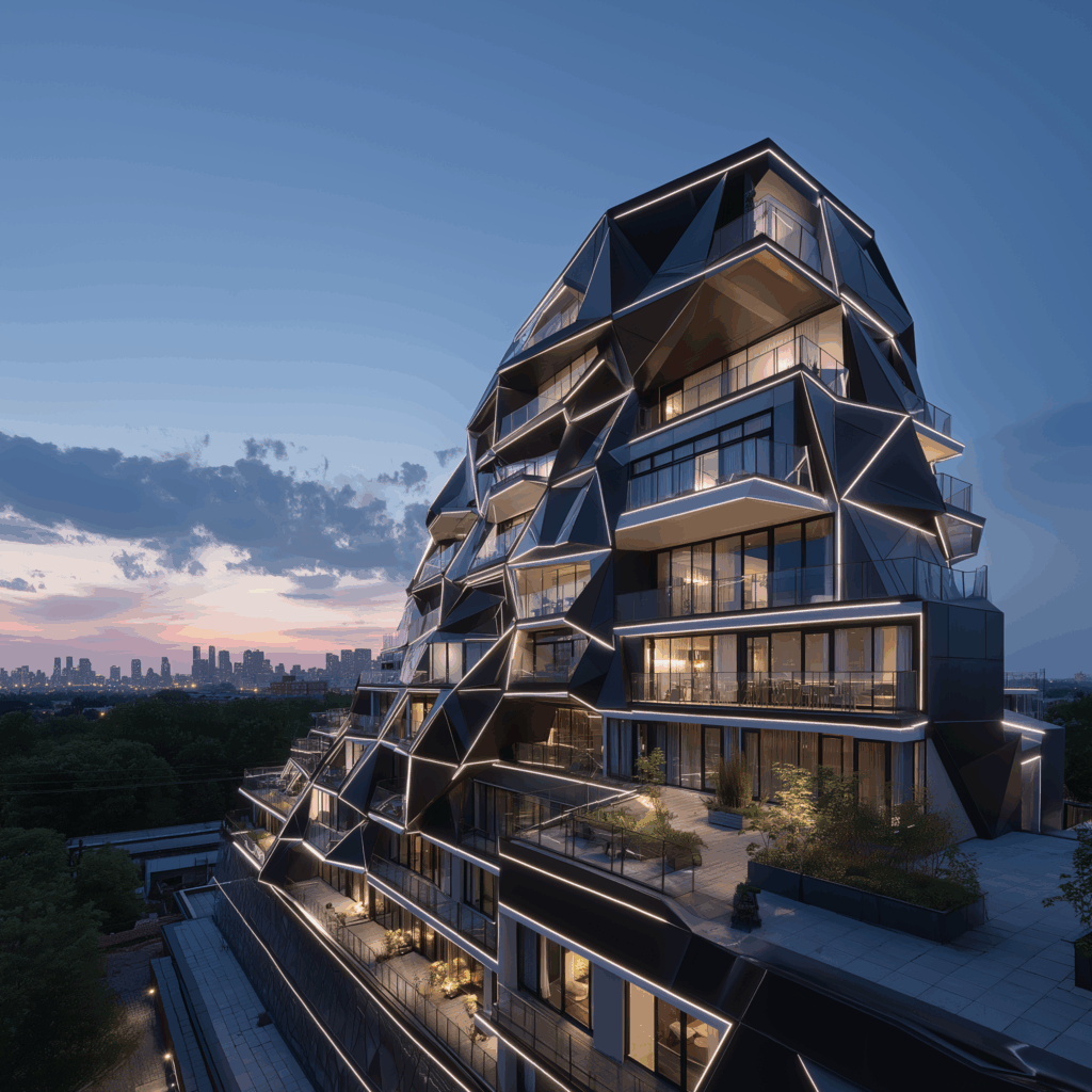 - Yaklaşım: Katmanlı geometrilerle ışığın yönlendirildiği, doğayla iç içe bir dikey yaşam sistemi
