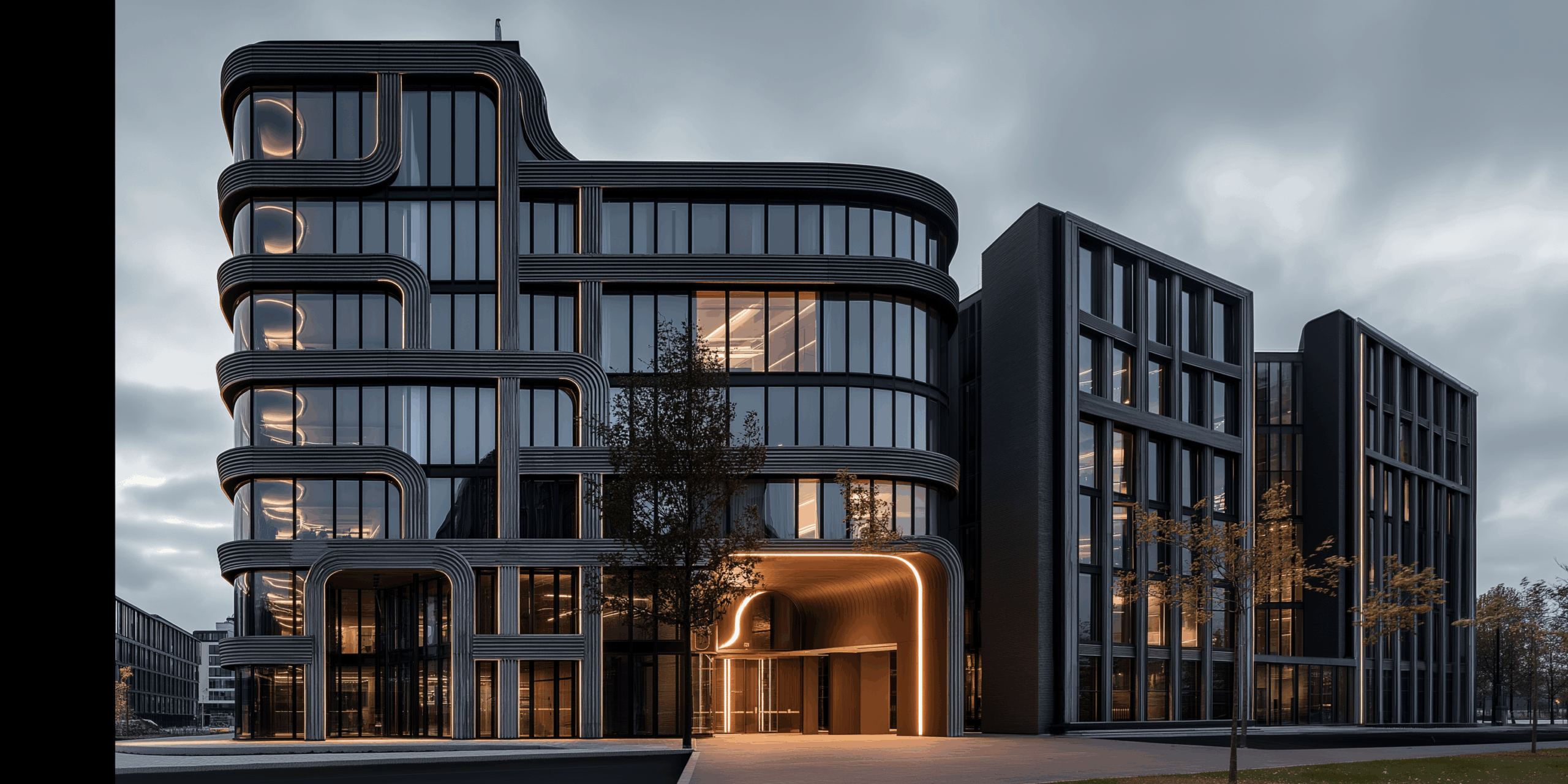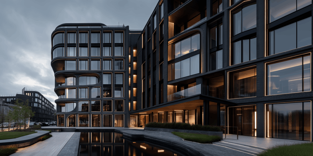 Obsidian Flow Residences”, kentin gri dokusunda ışıkla tanımlanan bir boşluk gibi yükselir.