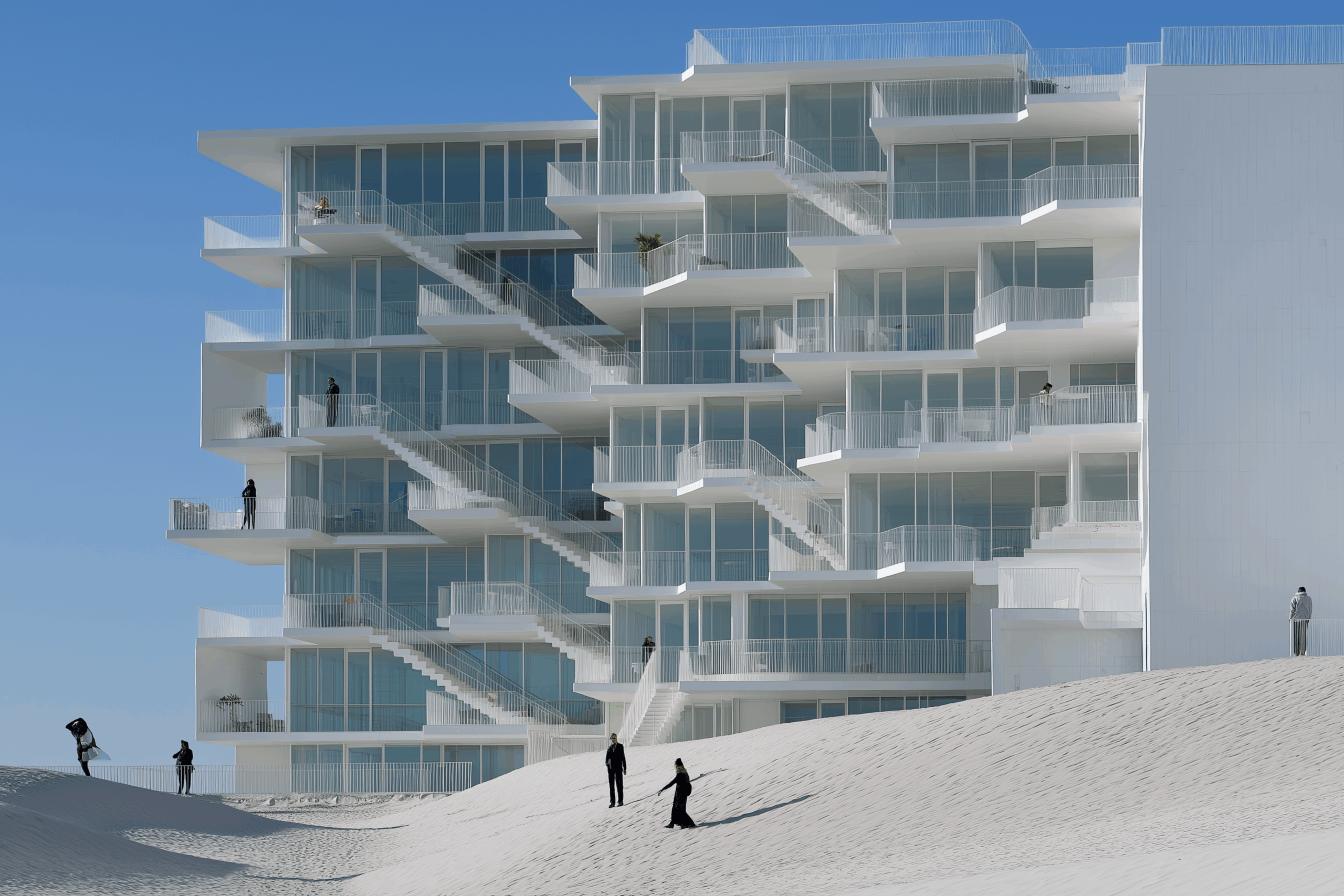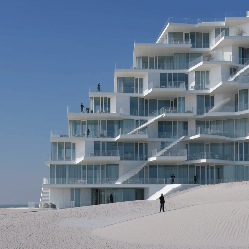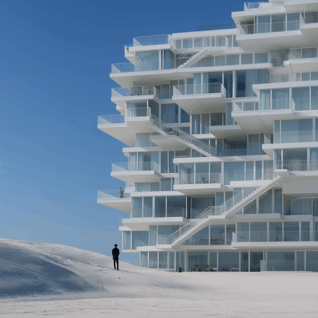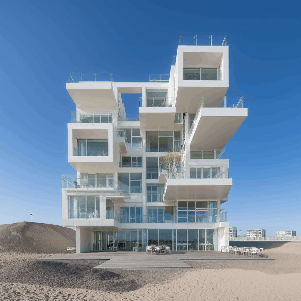 • Bağlam: Beyaz kum tepeleri arasında, doğrudan deniz ufkuna yönelmiş modernist konut bloğu