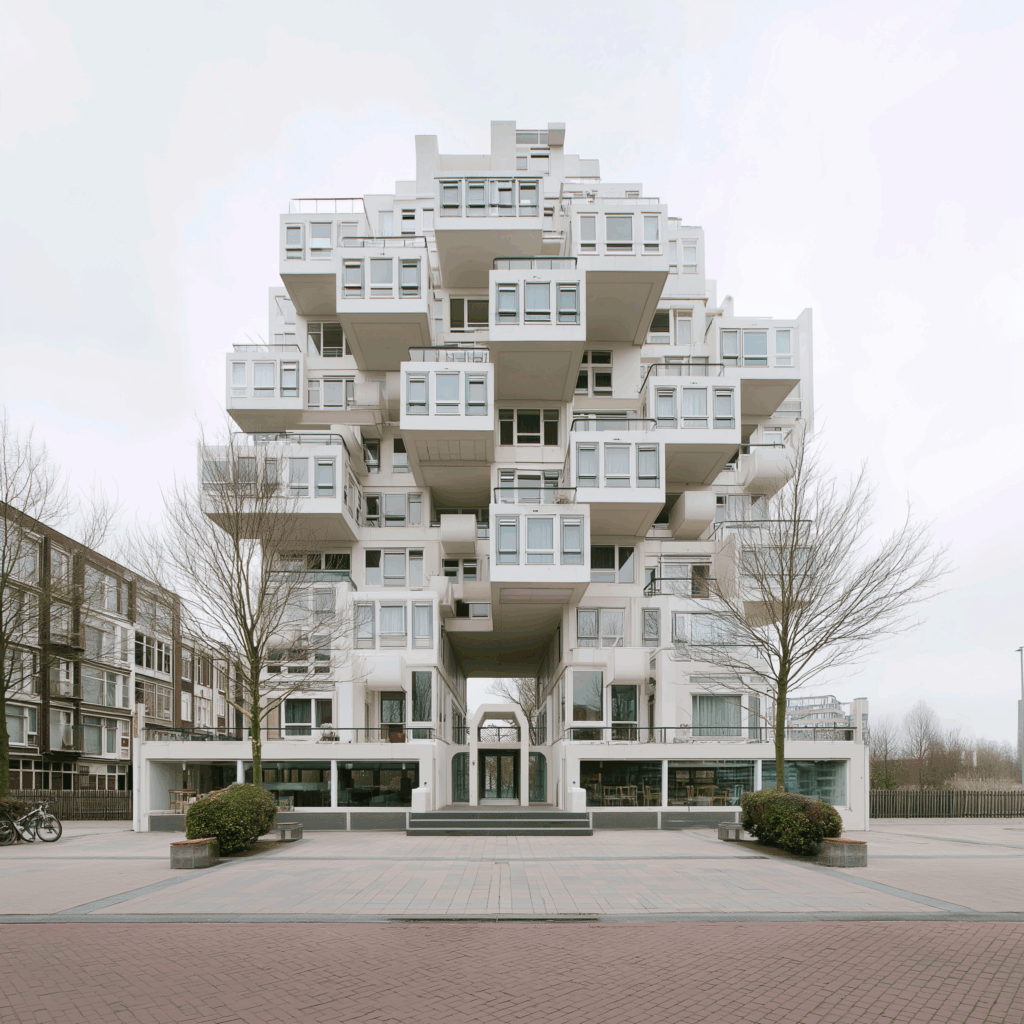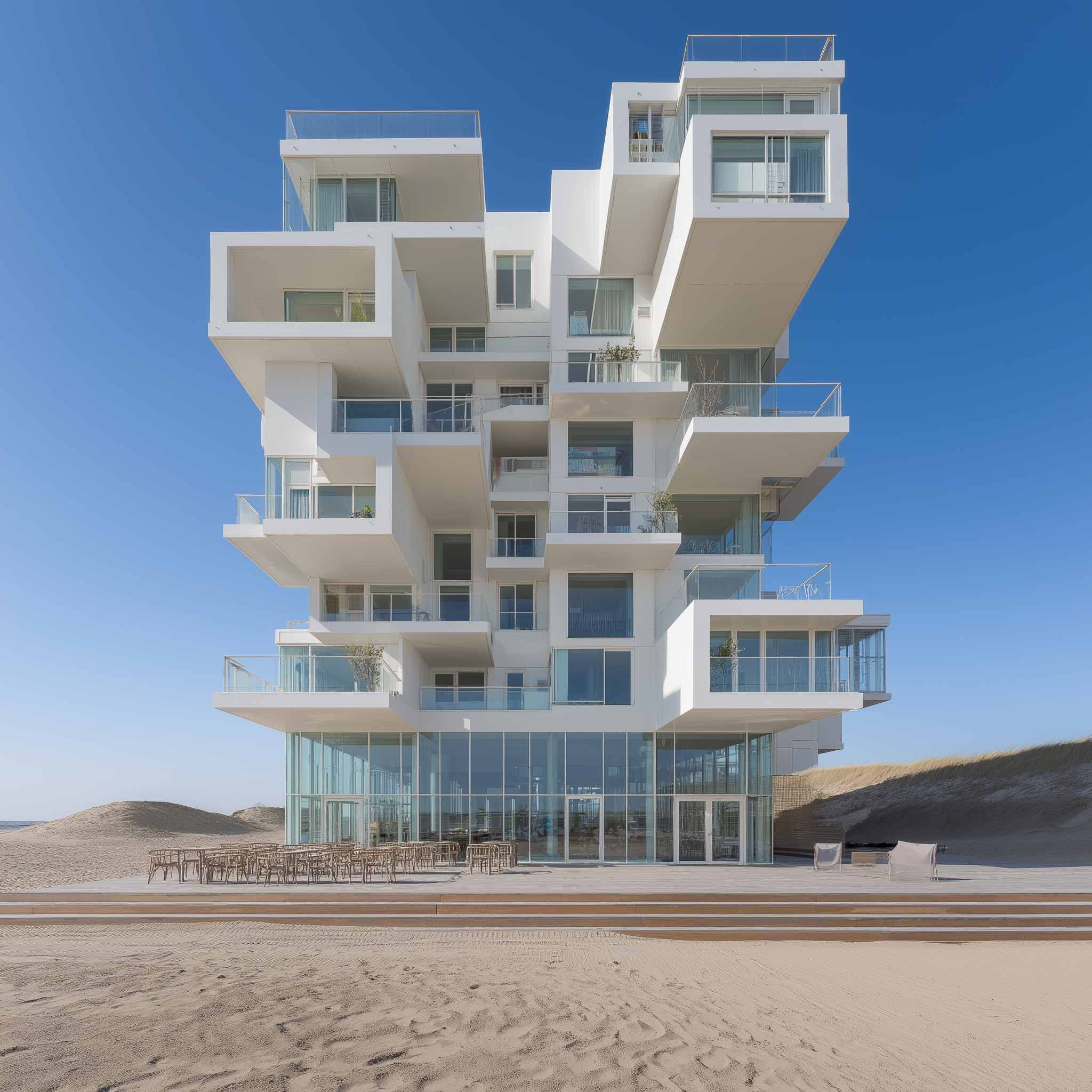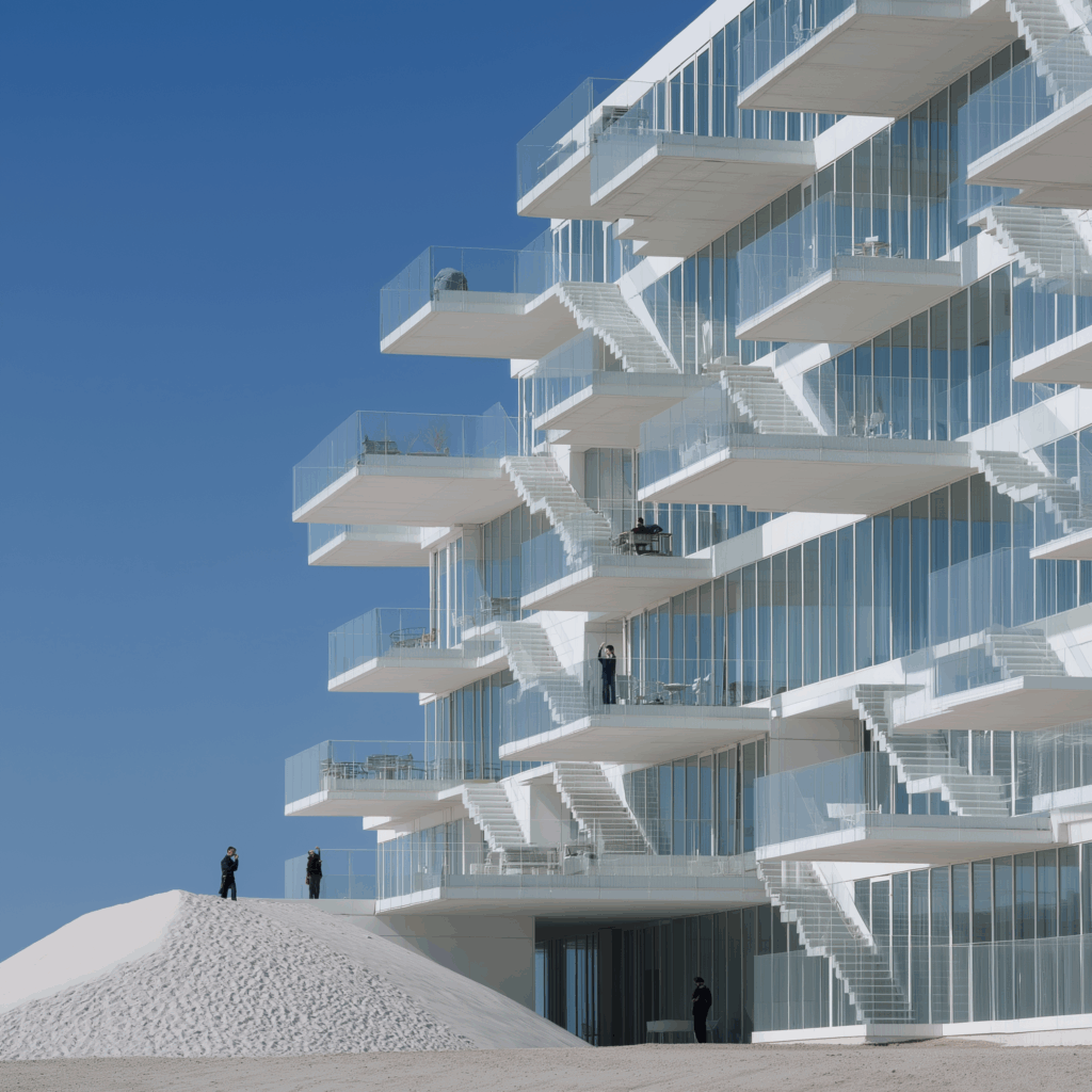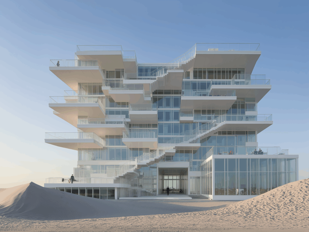 • Bağlam: Beyaz kum tepeleri arasında, doğrudan deniz ufkuna yönelmiş modernist konut bloğu