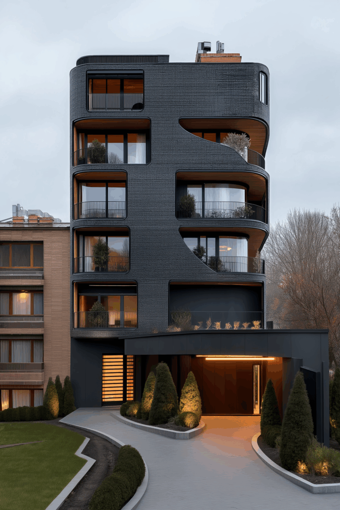 Kavisli köşeler, cepheyi hem akışkan hem de yumuşak hale getirir; bu, yapıyı çevredeki sert geometrilerden ayırarak davetkâr bir duruş kazandırır.