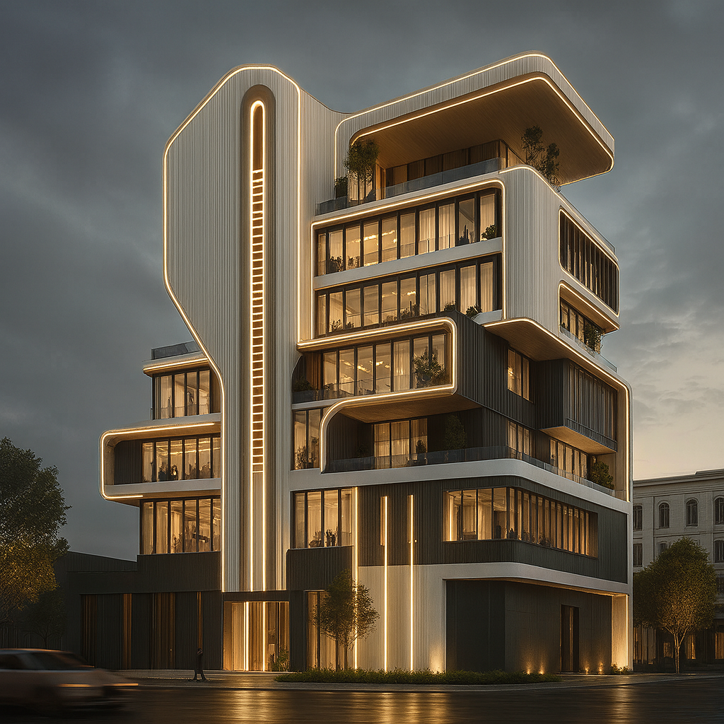 Cephe boyunca kesintisiz ilerleyen altın ışık hatları, binanın akışkan formunu vurgulayan bir kontur işlevi görür.